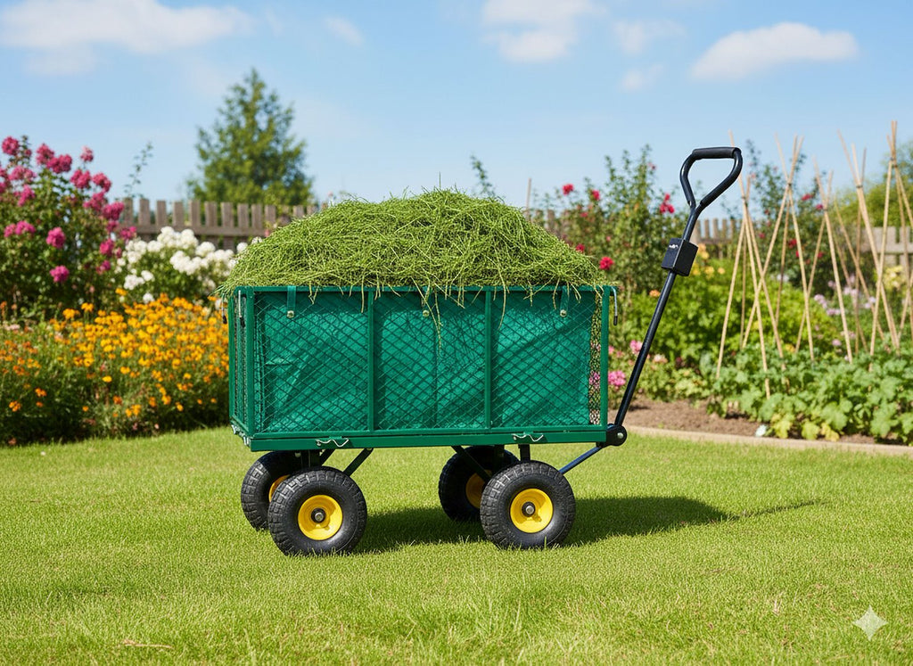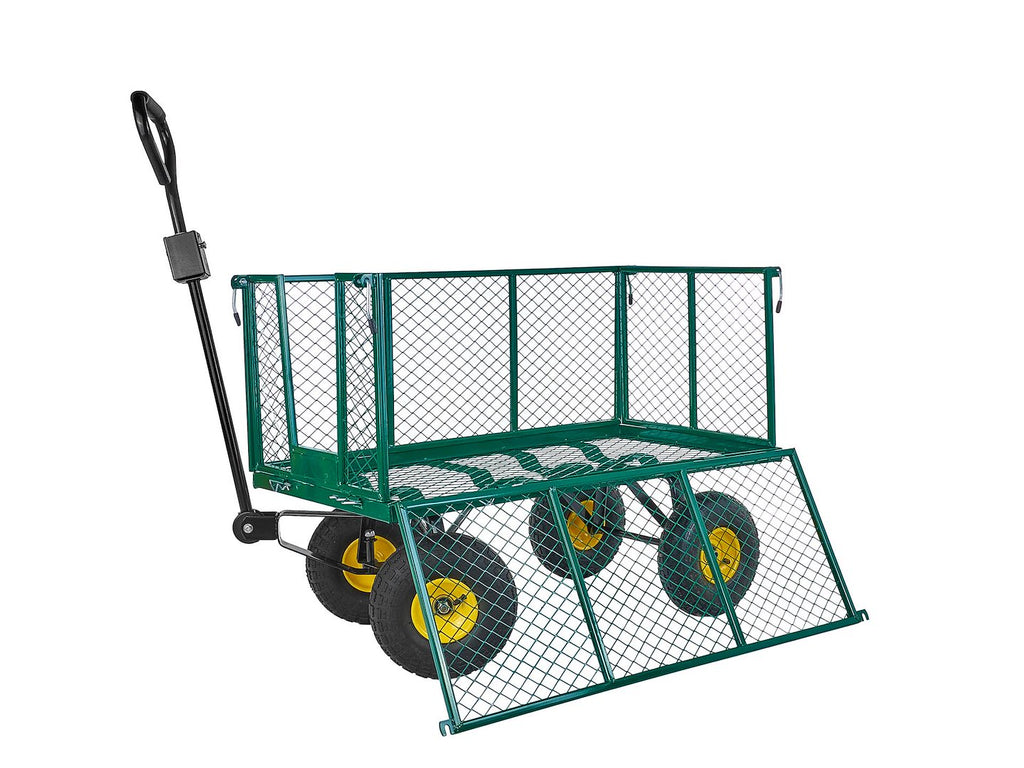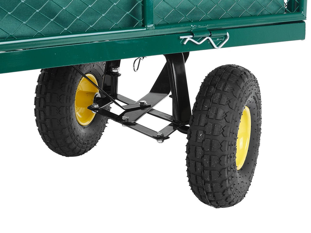 Acesta este echipat cu roti din cauciuc gonflabil cu diametrul de 10 inci, iar rotile din fata sunt pivotante pentru o manevrabilitate buna. Manerul are forma ergonomica si este acoperit cu material antiderapant. Caruciorul este livrat cu captuseala textila, care permite transportul materialelor vrac precum pamantul, nisipul sau frunzele.