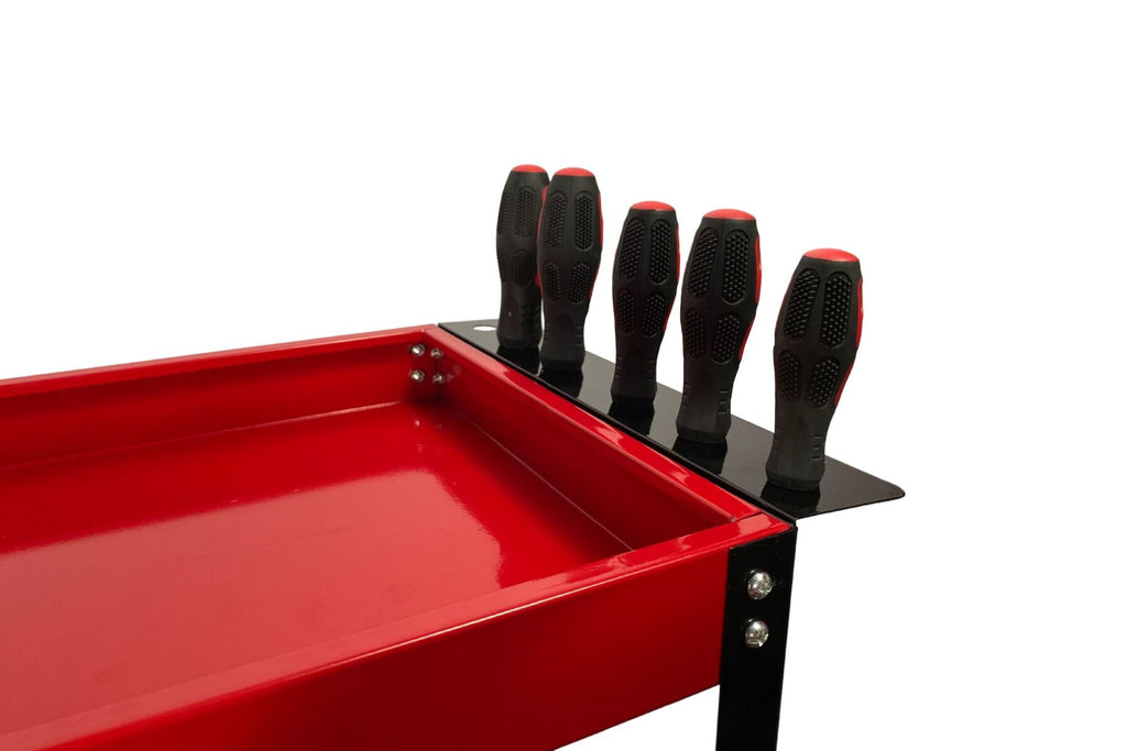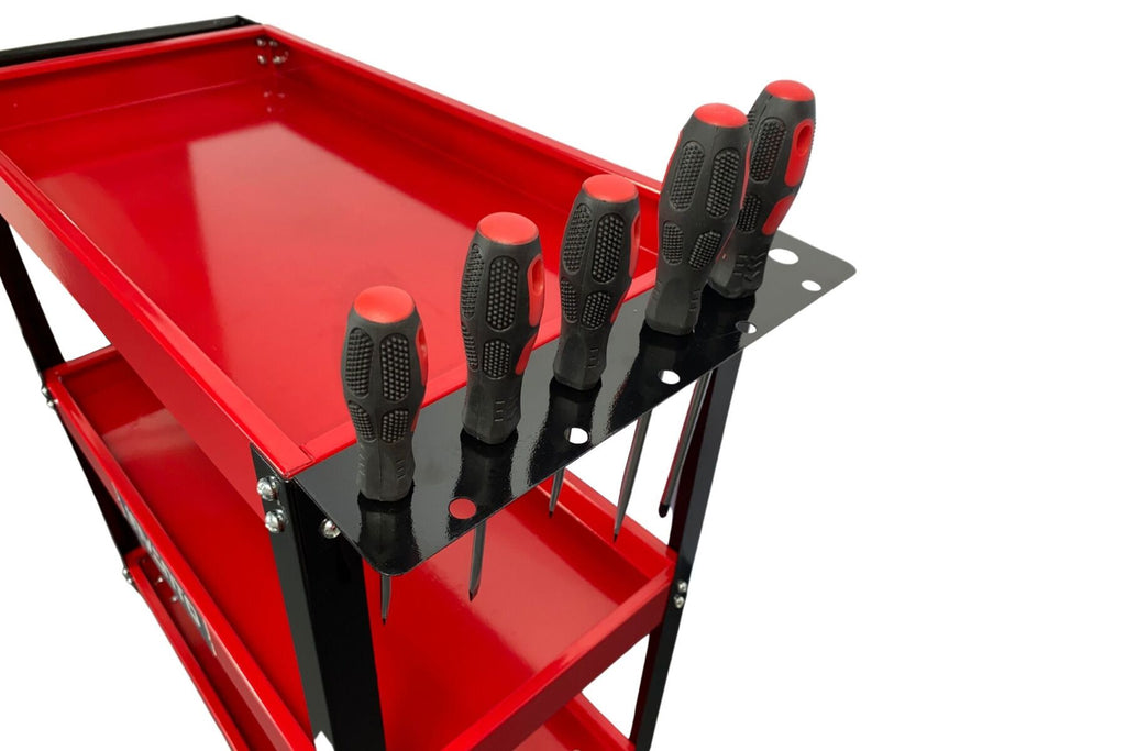 Acest CARUCIOR MOBIL METALIC CU 3 RAFTURI SI SUPORT SURUBELNITE INVENTO este destinat organizarii si transportului uneltelor in atelier sau garaj. Caruciorul este realizat din structura metalica si este prevazut cu trei rafturi din otel, fiecare avand dimensiunile de 650 x 350 x 55 mm.
