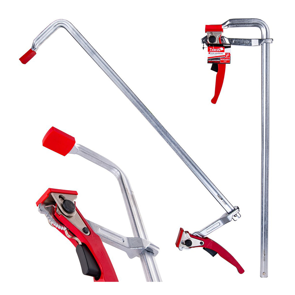 Aceasta CLEMA MENGHINA PENTRU TAMPLARIE CU CLICHET 600x120MM este destinata fixarii pieselor din lemn in timpul operatiunilor de taiere, lipire sau montaj. Este realizata din otel forjat si este acoperita cu strat protector cromat pentru protectie impotriva coroziunii. Asigura o forta de strangere de pana la 500 kg. Deschiderea maxima este de 600 mm, iar adancimea este de 120 mm. Este prevazuta cu protectii din plastic pentru a preveni deteriorarea suprafetelor materialelor fixate. Sistemul cu clichet permite strangerea si reglarea cu o singura mana.