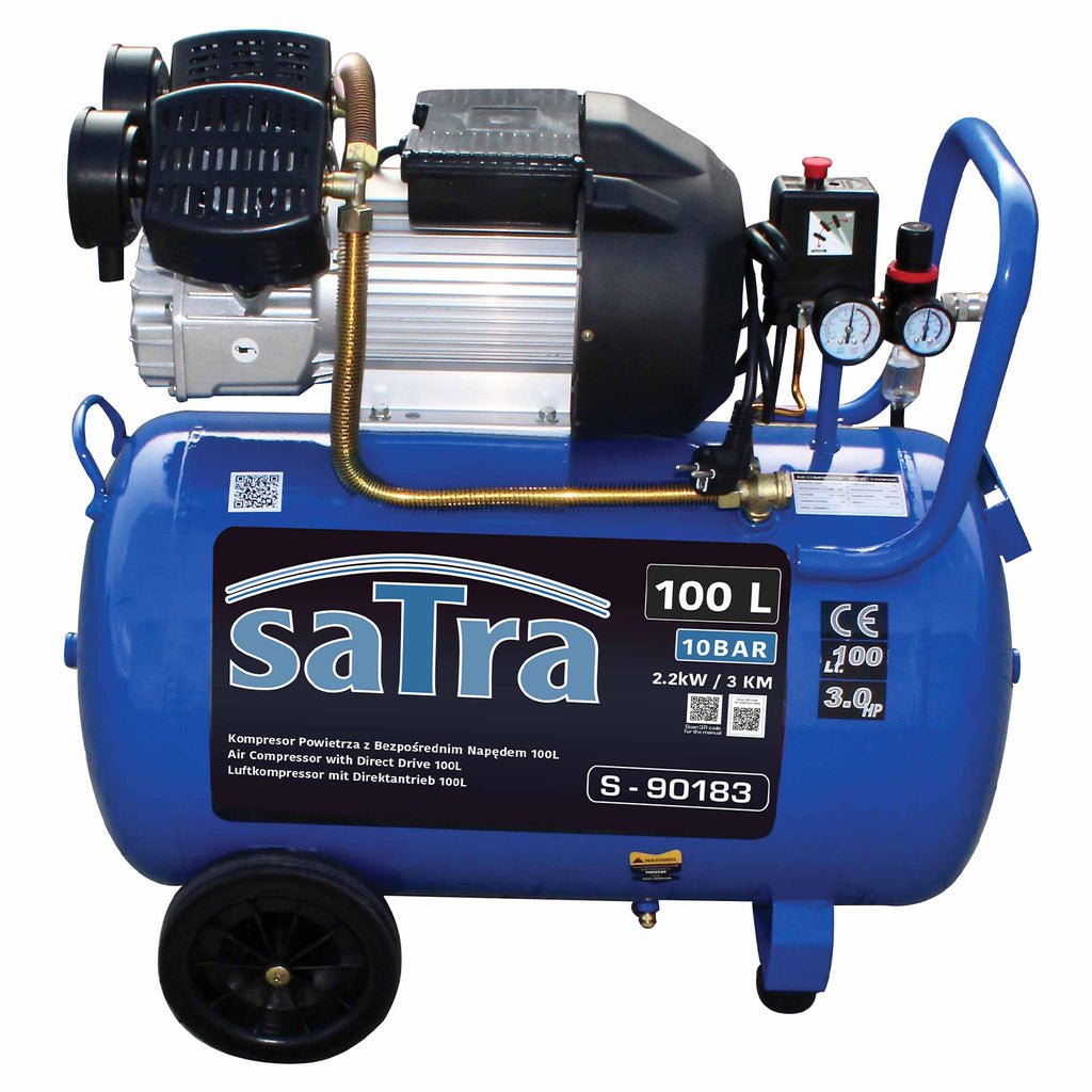 COMPRESORUL DE AER CU ANGRENARE DIRECTA 100L este un compresor de ulei cu doua pistoane dispuse in configuratie V, cu viteza redusa, echipat cu un rezervor de 100 de litri. Pistoanele din aluminiu si cilindrii din fonta asigura o disipare eficienta a caldurii si o durata lunga de functionare. Motorul electric are o putere de 2,2 kW, echivalenta cu 3 CP, functioneaza la o tensiune de 220 V si frecventa de 50 Hz si atinge o viteza de 2850 rotatii pe minut. Capacitatea maxima este de 360 litri pe minut, iar presiunea de lucru este de 10 bari.