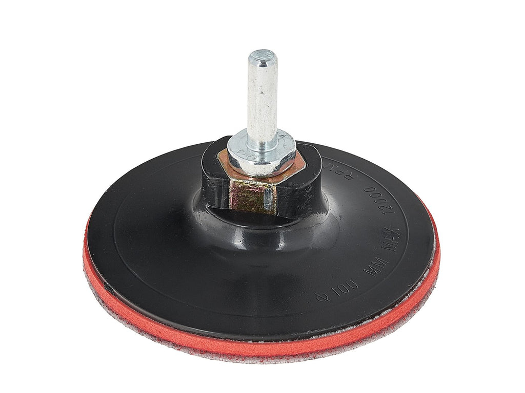 Discul are diametrul de 100 mm si este prevazut cu sistem de prindere tip Velcro. Suportul este realizat din material rezistent, cu strat de amortizare din spuma (culoare rosie). Setul include un disc suport cu prindere M14, un adaptor pentru masina de gaurit (filet exterior M14 – tija 6 mm) si un disc abraziv.