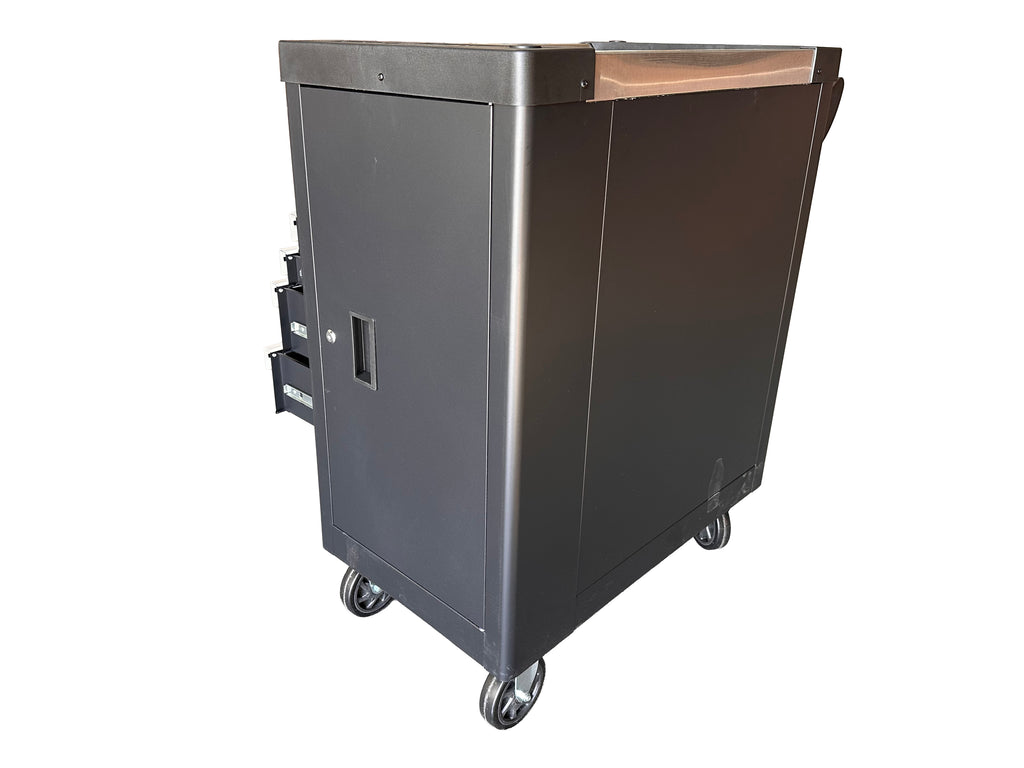 Este echipat cu 2 roti pivotante si 2 roti fixe, dintre care 2 roti sunt prevazute cu sistem de franare. Placa superioara este prevazuta cu compartimente pentru depozitare, iar in spatele usii exista un spatiu de depozitare reglabil. Manerul este robust pentru manevrare usoara.
