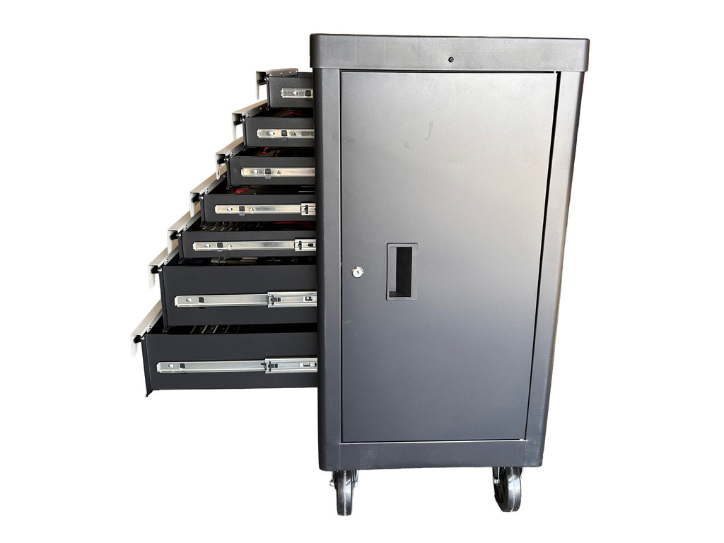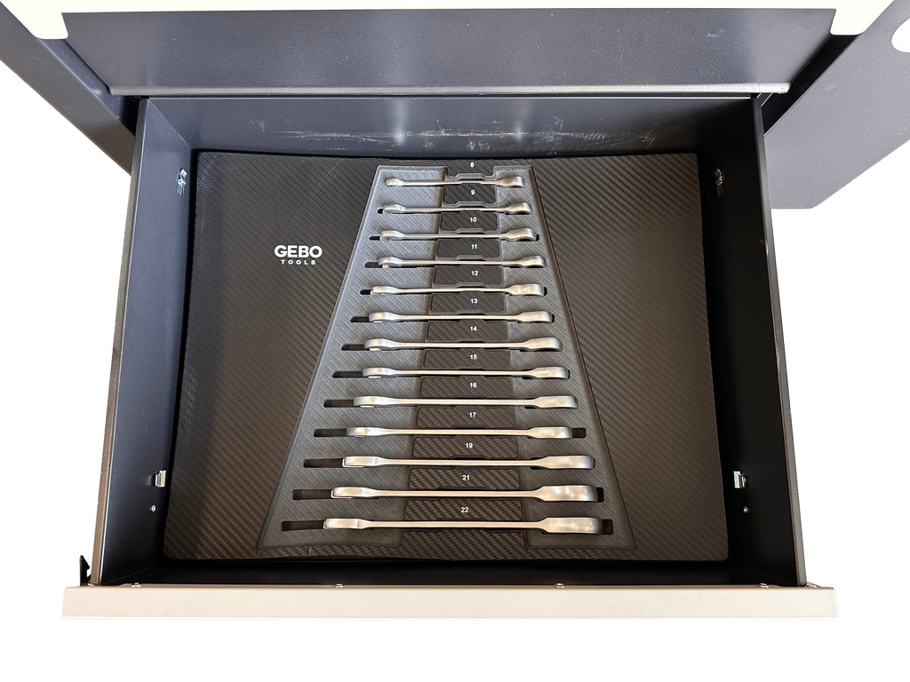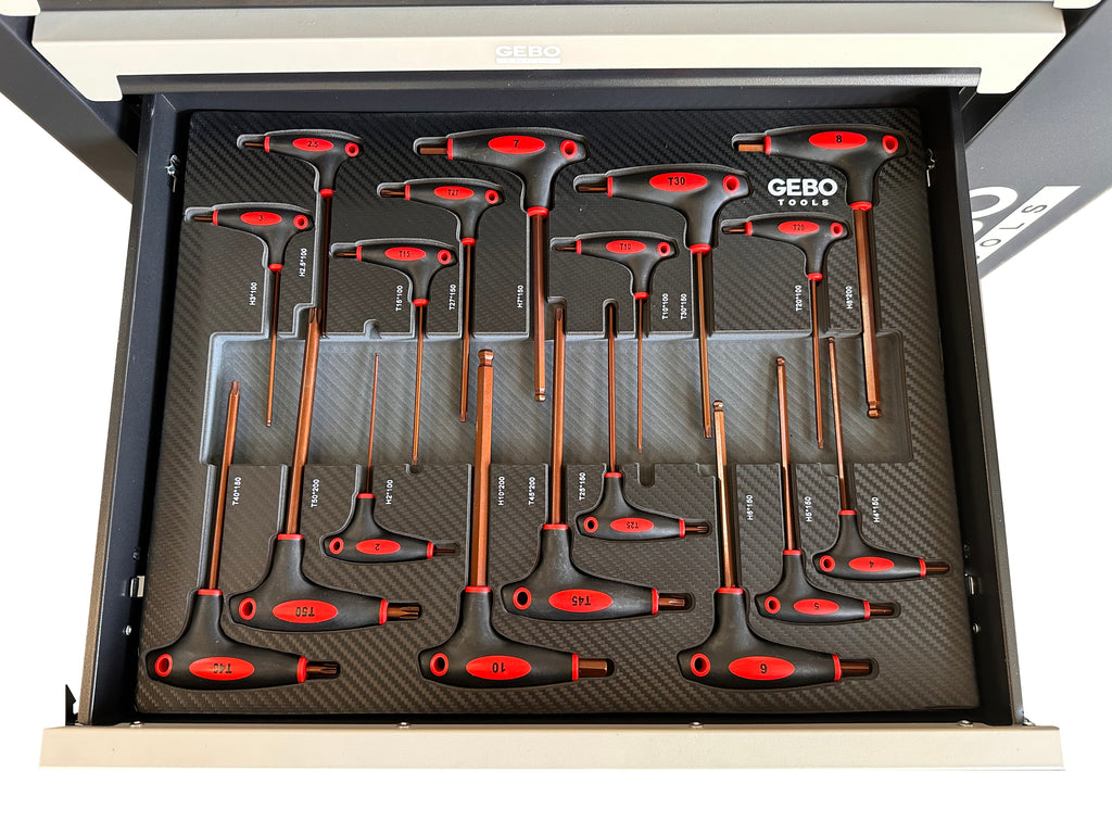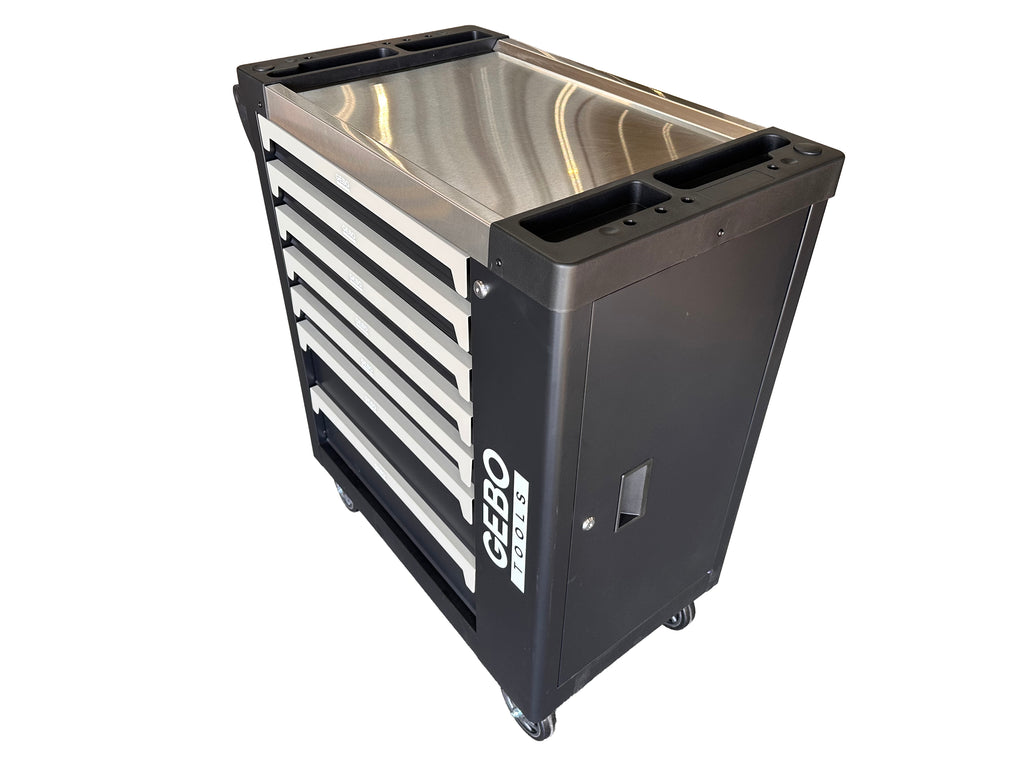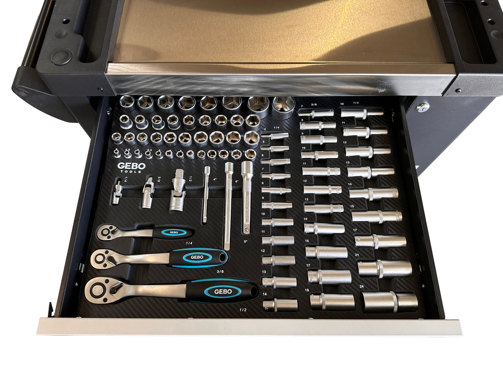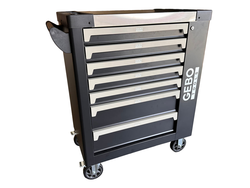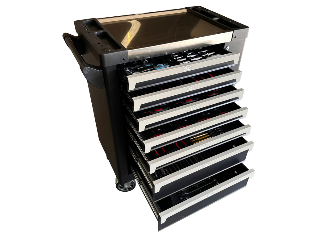 Acest DULAP DE SCULE ECHIPAT PROFESIONAL CU 7 SERTARE, 7 MODULE CARBON, 262 PIESE GEBO TOOLS este destinat utilizarii in ateliere auto, garaje si spatii profesionale, oferind organizare eficienta si acces rapid la un set complet de scule. Dulapul este prevazut cu 7 sertare echipate, sistem de culisare pe rulmenti, inchidere centralizata si posibilitate de blocare individuala a fiecarui sertar.