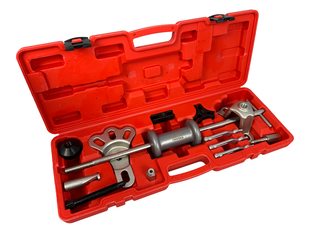 Trusa este compusa din 13 piese, incluzand tija cu ciocan culisant, 2 extractoare, adaptor pentru cheie, brate de extragere, cap de cuplare cu 3 brate, cap de cuplare cu 2 brate, carlig, manson, surub autofiletant si 3 suruburi.