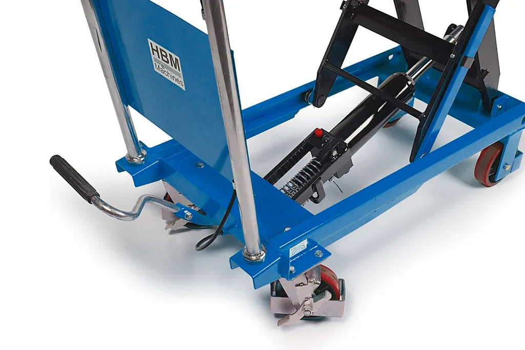 MASA DE LUCRU HIDRAULICA HBM OLANDA, MOBILA, 500 KG, CU PEDALA DE RIDICARE, INALTIME REGLABILA PANA LA 90 CM este un echipament proiectat pentru manipularea si pozitionarea precisa a sarcinilor de pana la 500 kg. Platforma are dimensiunile de 860 mm lungime si 500 mm latime. Sistemul de ridicare este actionat manual prin pedala, utilizand un mecanism hidraulic cu cursa verticala controlata. Inaltimea platformei este reglabila intre 340 mm (minim) si 900 mm (maxim).