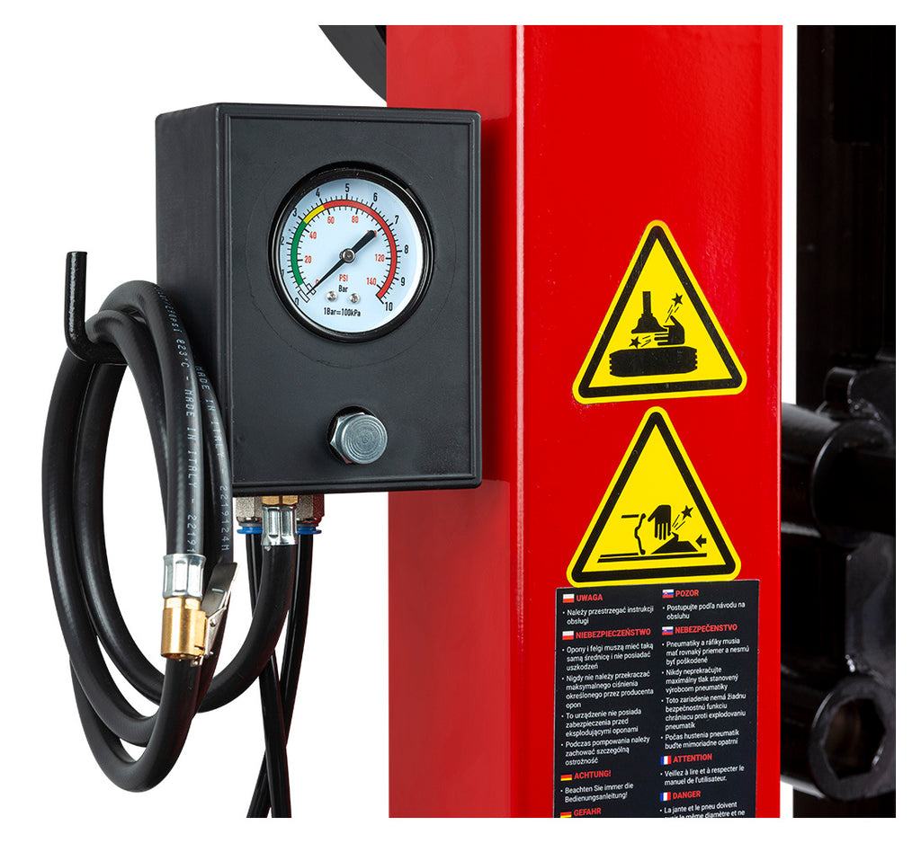 Echipamentul standard include unitate de filtrare si lubrifiere cu separator de apa, pistol de umflare cu manometru, capace din plastic pentru picior, falci si ciocan, lingura de asamblare, recipient pentru accesorii, brat 3D1 cu rola, placa, copita si con de centrare, a treia mana si capac pentru marginea jantei. Masina dispune de functie de umflare integrata si suport RUNFLAT.