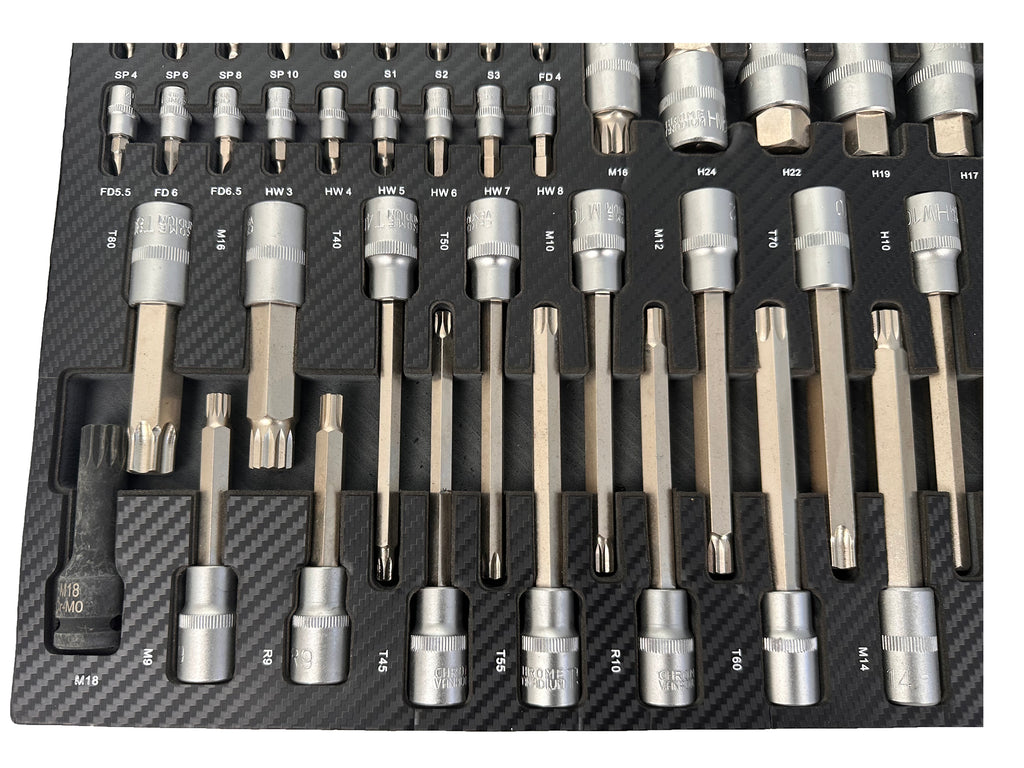 Setul contine 101 piese, organizate pe dimensiuni si tipuri de prindere 1/4", 8 mm si 1/2", fiind potrivit pentru lucrari mecanice, auto si industriale.