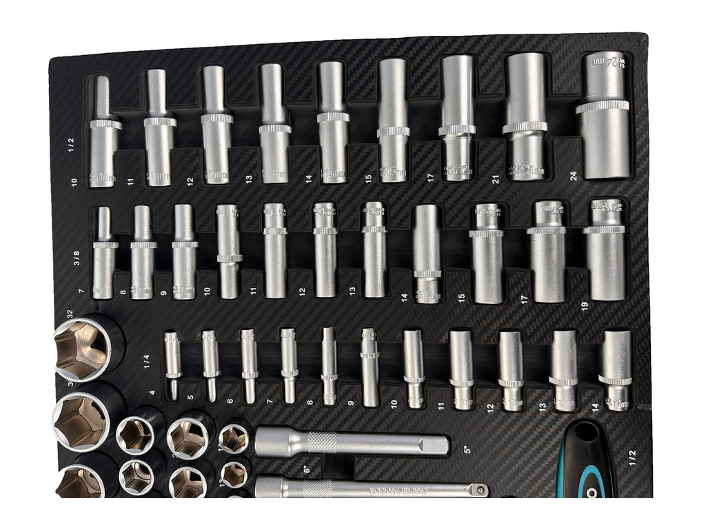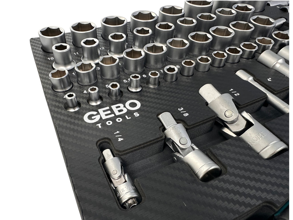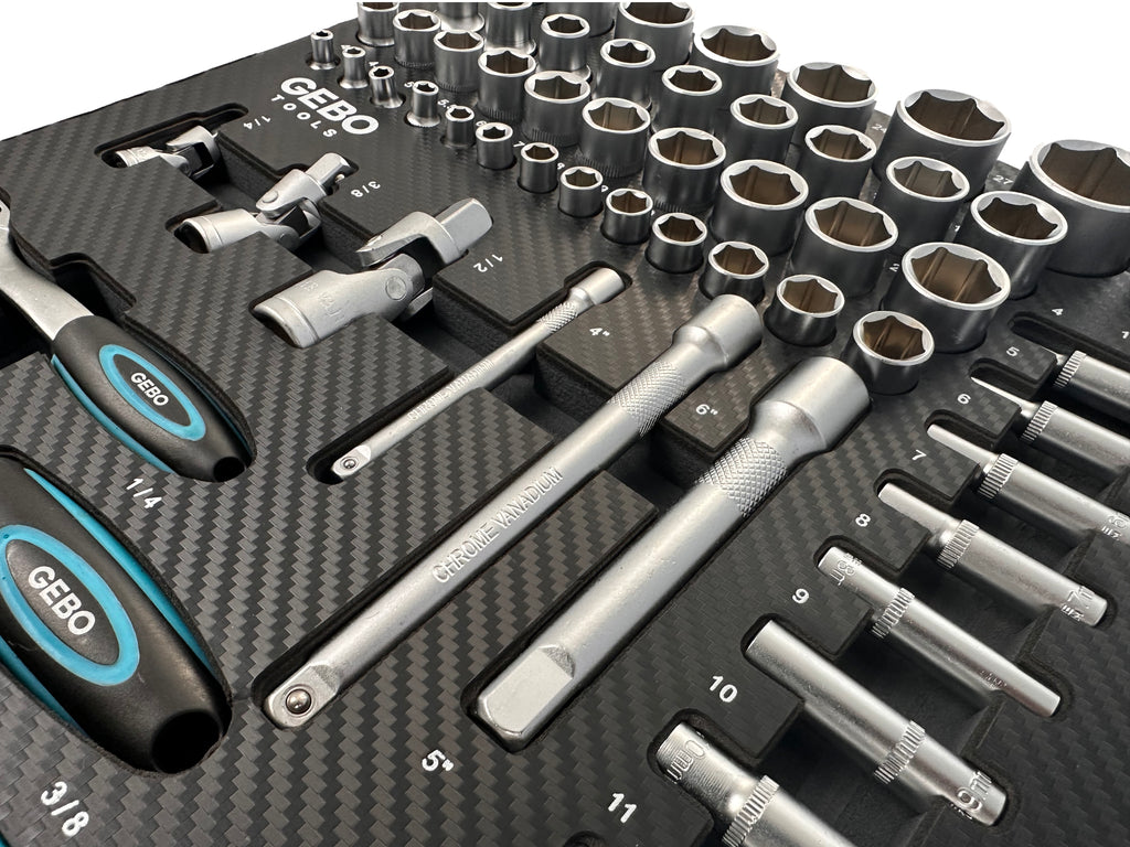 Acest MODUL DULAP CHEI TUBULARE SI CLICHET 81 PIESE GEBO TOOLS este destinat organizarii in sertare de dulap pentru scule. Piesele sunt realizate din otel crom-vanadiu (CrV) de calitate superioara, fiind potrivite pentru utilizare profesionala in ateliere auto si mecanice. Modulul este livrat in suport din burete cu dimensiunile de 54 x 39.5 x 3 cm.