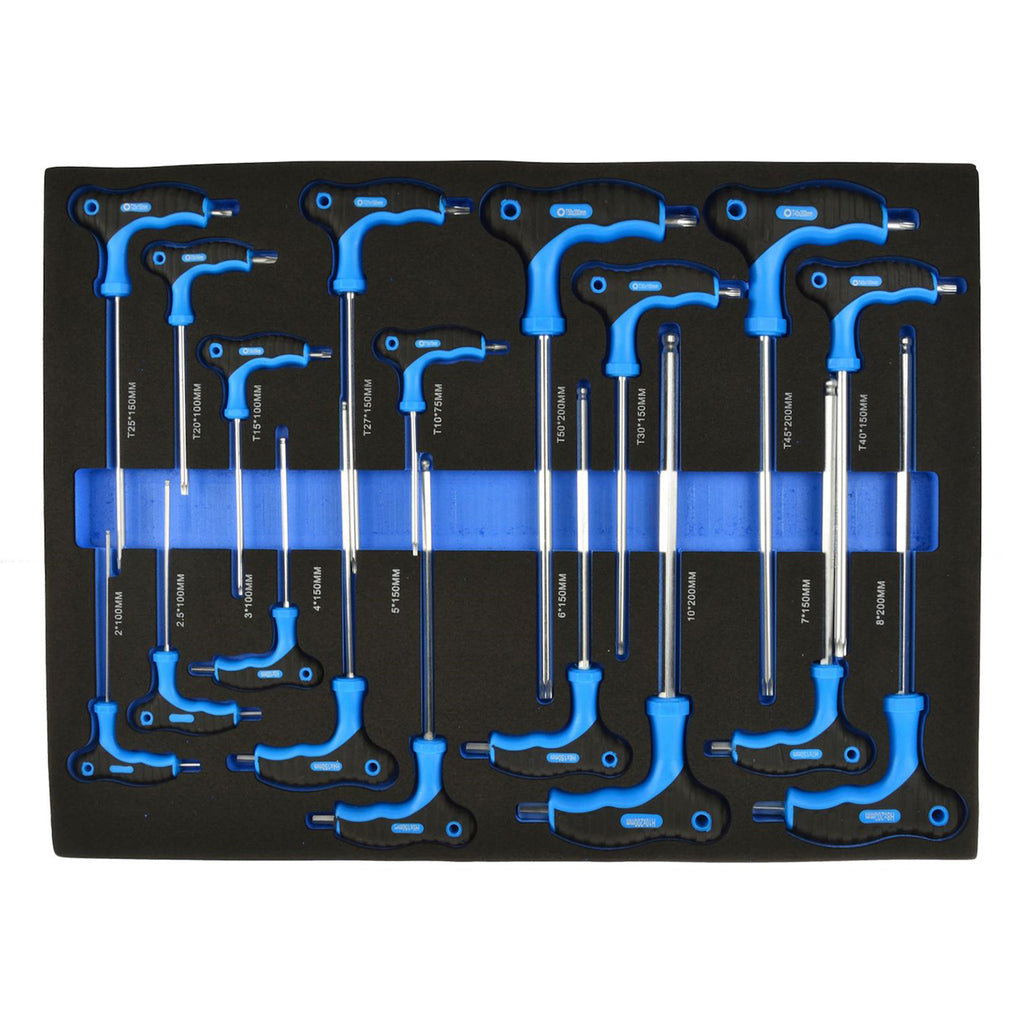 De asemenea, sunt incluse chei imbus hexagonale cu maner T in dimensiunile H2 cu lungimea de 100 mm, H2.5 cu lungimea de 100 mm, H3 cu lungimea de 100 mm, H4 cu lungimea de 150 mm, H5 cu lungimea de 150 mm, H6 cu lungimea de 150 mm, H7 cu lungimea de 150 mm, H8 cu lungimea de 200 mm si H10 cu lungimea de 200 mm.