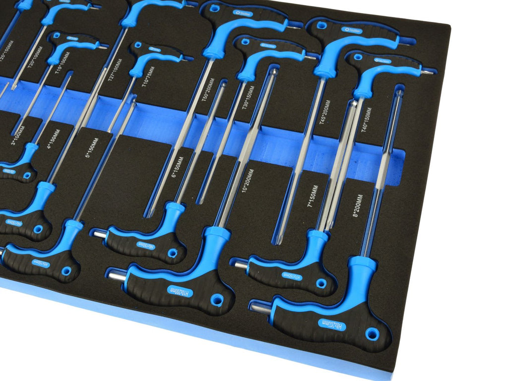 Acest MODUL DULAP TORX IMBUS CU MANER T 18 PIESE GEKO este destinat organizarii cheilor Torx si imbus cu maner tip T intr-un dulap de scule. Setul contine chei Torx cu maner T in dimensiunile T10 cu lungimea de 75 mm, T15 cu lungimea de 100 mm, T20 cu lungimea de 100 mm, T25 cu lungimea de 150 mm, T27 cu lungimea de 150 mm, T30 cu lungimea de 150 mm, T40 cu lungimea de 150 mm, T45 cu lungimea de 200 mm si T50 cu lungimea de 200 mm.