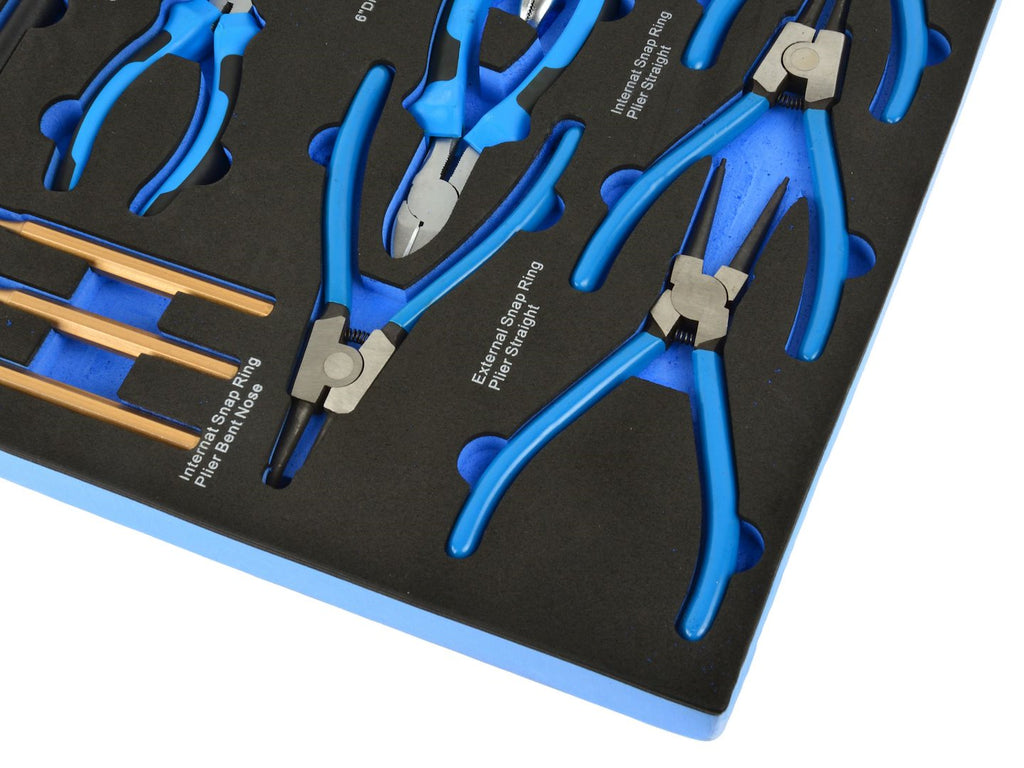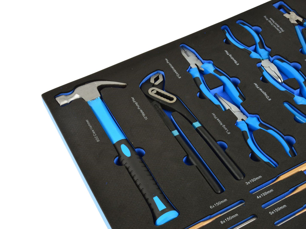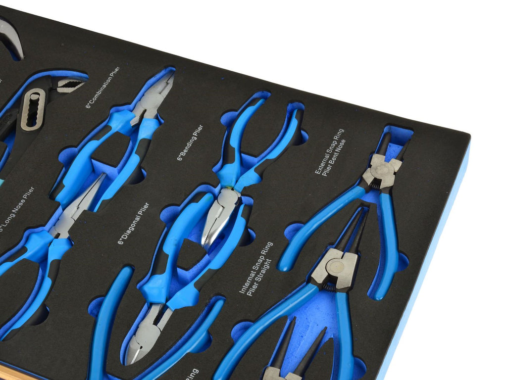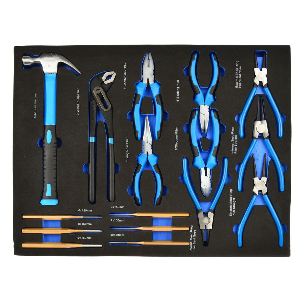 Acest MODUL PENTRU DULAP DE SCULE, CLESTI, DORNURI SI CIOCAN, 16 PIESE GEKO include un set de unelte destinat organizarii in sertare de dulap pentru scule. Setul este compus dintr-un ciocan cu gheara de 8 OZ, un cleste pentru tevi tip papagal de 10", cleste combinat de 6", cleste cu varf lung de 6", cleste cu varf indoit de 6", cleste taietor diagonal de 6", cleste pentru sigurante interioare indoit la 90° de 6", cleste pentru sigurante exterioare indoit la 90° de 6", cleste pentru sigurante interioare drept de 6" si cleste pentru sigurante exterioare drept de 6". Setul mai include sase dornuri cu lungimea de 150 mm si tija octogonala, in dimensiunile 3x150 mm, 4x150 mm, 5x150 mm, 6x150 mm, 8x150 mm si 10x150 mm.