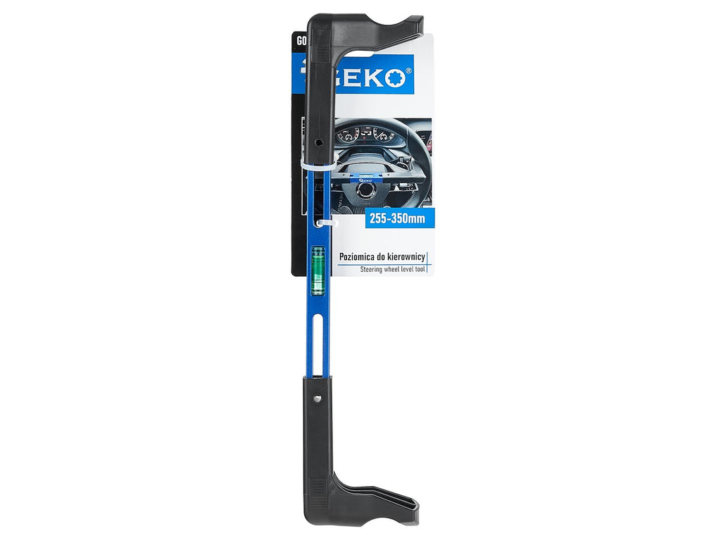 NIVELA PENTRU POZITIONARE VOLAN 255-350MM GEKO este proiectata pentru centrarea precisa a volanului in timpul lucrarilor de aliniere a directiei. Este echipata cu o fiola cu bula integrata pentru nivelare in raport cu axa longitudinala a vehiculului. Intervalul de reglare este de 255-350 mm.