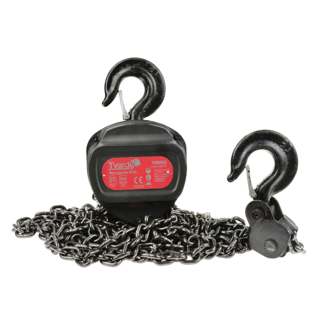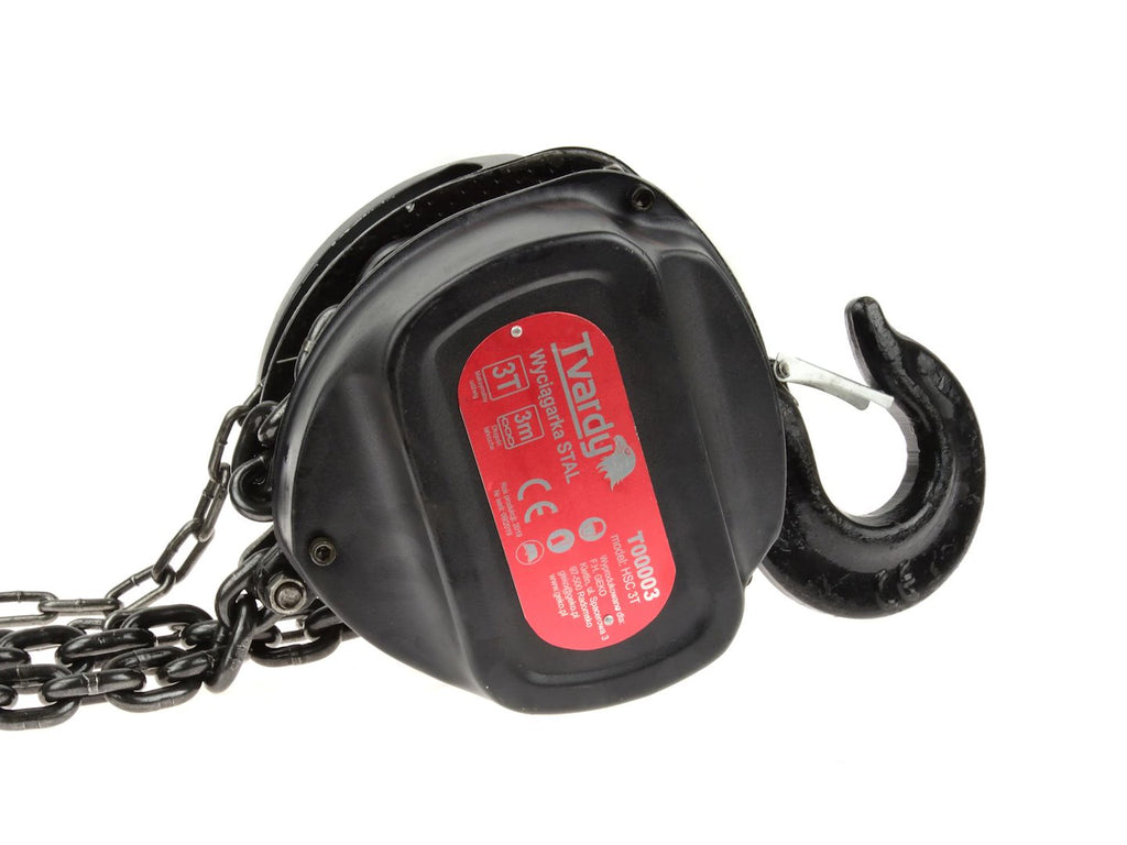 Acest PALAN 3T LANT 3M TVARDY are capacitate de ridicare de pana la 3000 kg si inaltime de ridicare de 3 m. Lantul de sarcina are diametrul de 8 mm si este fabricat din otel aliat G80. Este prevazut cu doua carlige din otel pentru montaj variabil, iar carligul de siguranta este realizat din otel inoxidabil. Constructia este destinata utilizarii manuale. Produsul este certificat CE.