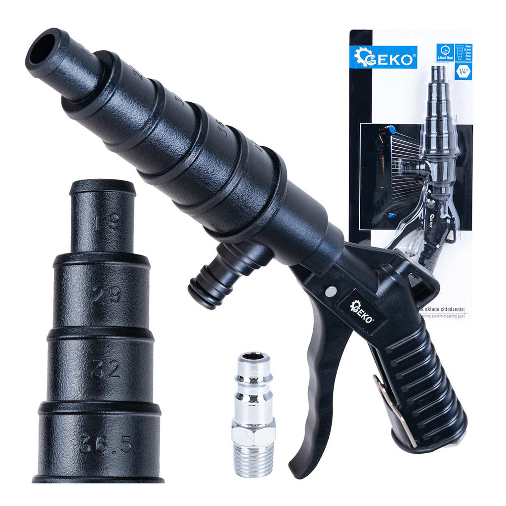 Acest PISTOL DE CURATARE SISTEM CIRCUIT DE RACIRE MOTOR AUTO, 1/4 GEKO este destinat spalarii canalelor de racire ale motoarelor auto si este prevazut cu racord pneumatic de 1/4”. Acesta are o lungime de 30 cm si este realizat din plastic si otel. Functioneaza la o presiune maxima de lucru de 6,3 bar (90 psi) si este echipat cu duze interschimbabile in cinci dimensiuni, de 19 mm, 29 mm, 32 mm, 36,5 mm si 40 mm, pentru adaptarea la diferite diametre de racord. Pistolul este utilizat pentru curatarea radiatoarelor, miezurilor de incalzire, blocurilor motor si a altor circuite de transport al lichidelor.