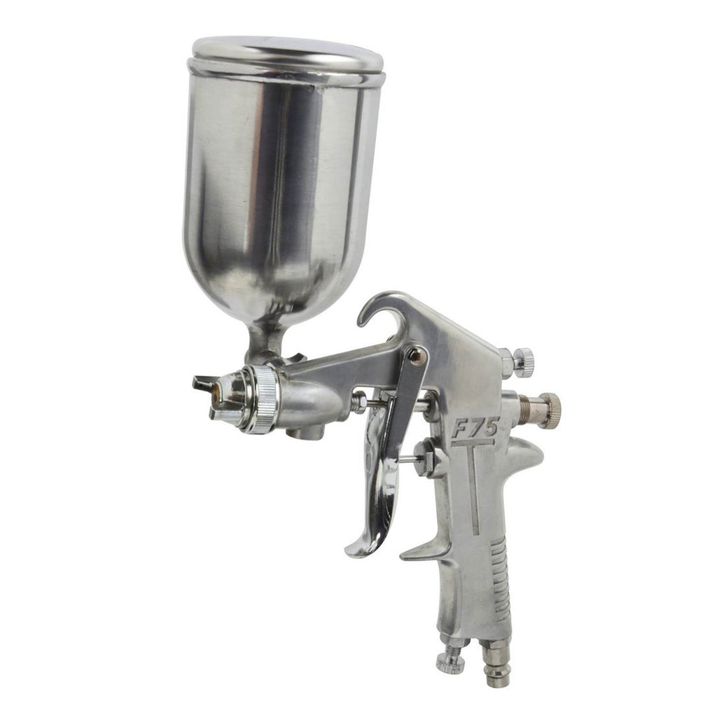 Acest PISTOL DE VOPSIT CU REZERVOR METALIC 300ML GEKO este echipat cu un rezervor metalic cu capacitatea de 300 ml si duza cu diametrul de 1.5 mm. Functioneaza la o presiune de lucru de 4.5 kg/cm² si are un debit de material cuprins intre 150 si 200 ml pe minut.