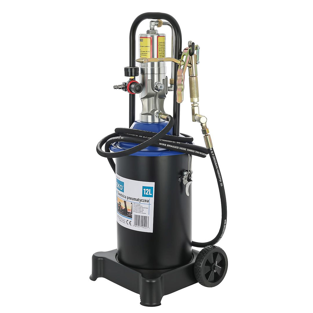 Aceasta POMPA DE GRESAT PNEUMATICA 12L GEKO este destinata aplicarii unsorii prin actionare pneumatica si este conceputa pentru utilizare mobila. Echipamentul este prevazut cu un rezervor cu capacitatea de 12 litri, realizat dintr-un corp presat fara sudura, si permite livrarea unsorii cu un debit de 0,82 l/min.