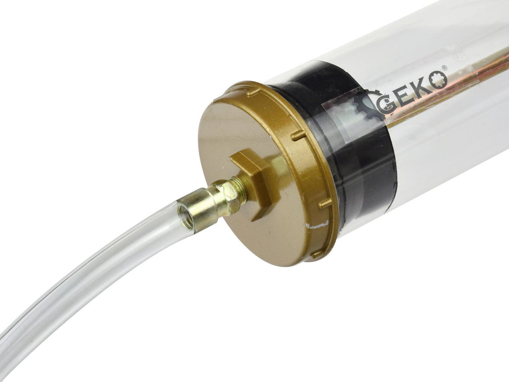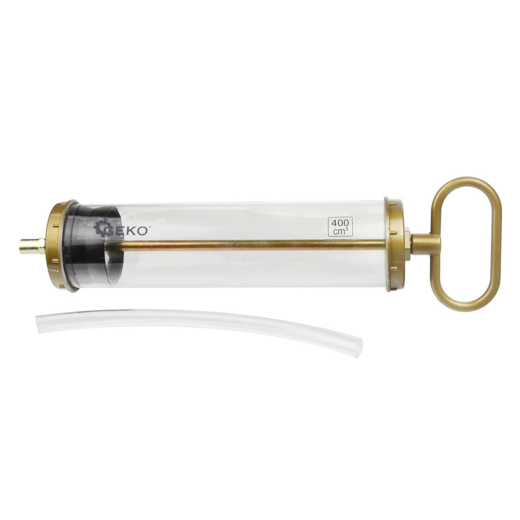 POMPA DRENAJ MANUALA PENTRU ULEI SI ALTE LICHIDE 400ML GEKO este destinata aspirarii sau transferului de ulei si alte lichide din motoare sau cutii de viteze. Corpul translucid permite verificarea vizuala a lichidului in timpul utilizarii, iar pistonul tip T-bar asigura actionarea manuala. Tubul are diametrul de 60 mm, iar pompa este livrata impreuna cu un furtun flexibil transparent de 12 x 230 mm.