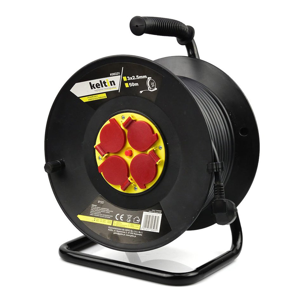 PRELUNGITORUL TAMBUR ELECTRIC 3x2.5MM 50M are o lungime de 50 de metri si un cablu cu sectiune transversala de 3 x 2,5 mm², tip H05VV-F. Acesta este echipat cu patru prize de 230 V prevazute cu capace de protectie si dispune de o siguranta termica integrata pentru protectie impotriva supraincalzirii.