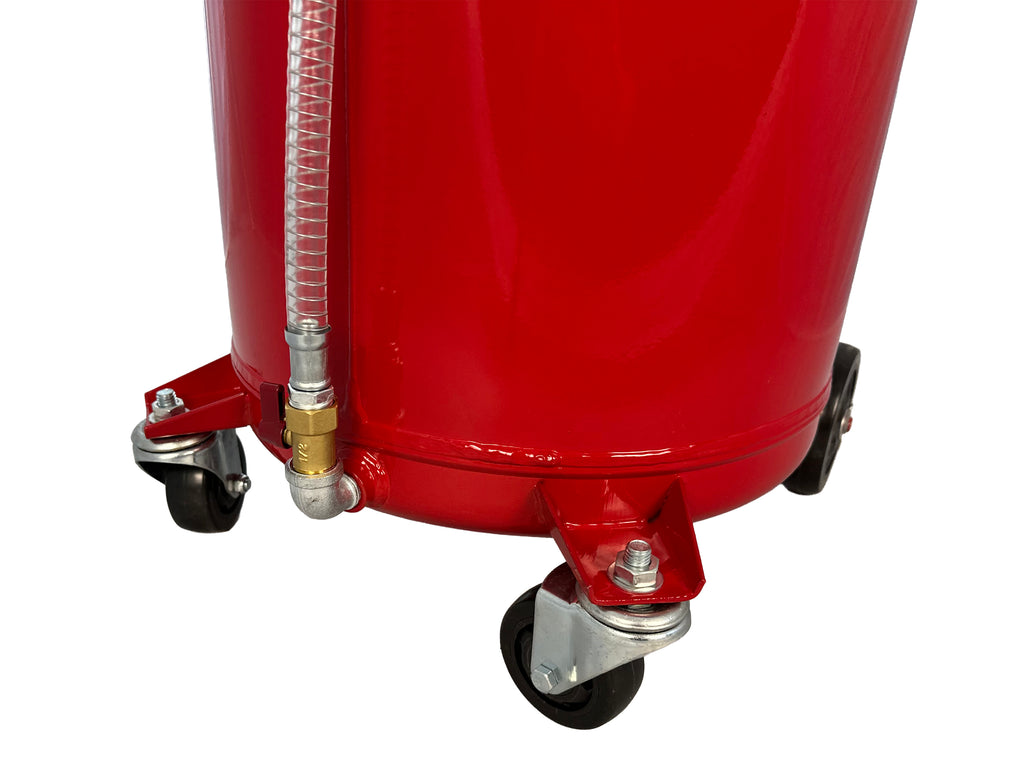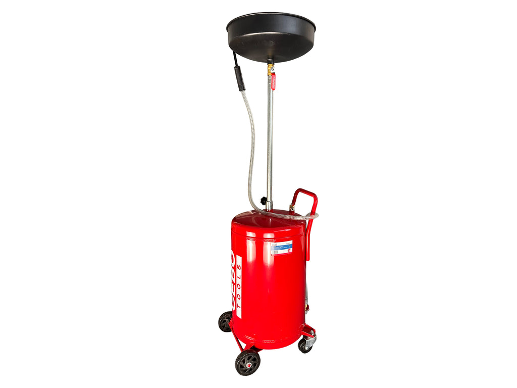 Componentele incluse sunt: bazin colector ulei, tija telescopica, furtun aspiratie ulei, manometru vacuum, vizor recipient masurare, ac aspiratie ulei, supapa de siguranta, furtun evacuare ulei, rezervor grosime 1.2 mm si roti pivotante.