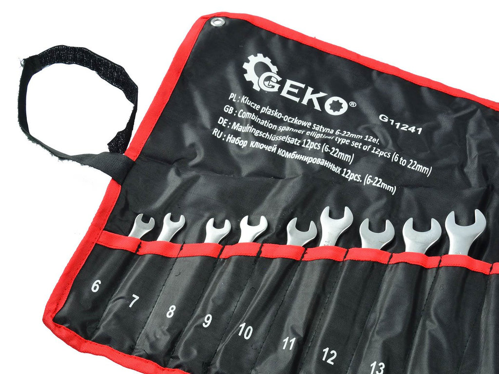 Acest SET 12 CHEI COMBINATE FIXE SI INELARE SATINATE CRV 6-22MM - GEKO include chei realizate din otel crom-vanadiu (CrV), cu finisaj crom si satin. Cheile sunt depozitate intr-un suport textil rezistent, cu inchidere tip Velcro si posibilitate de agatare pe perete. Capatul fix este inclinat la 15° fata de axul manerului, iar capatul inelar este cu 12 puncte si este inclinat la 15°. Cheile sunt fabricate conform standardelor ISO si DIN. Setul contine chei in dimensiunile 6, 7, 8, 9, 10, 11, 12, 13, 14, 17, 19 si 22 mm.