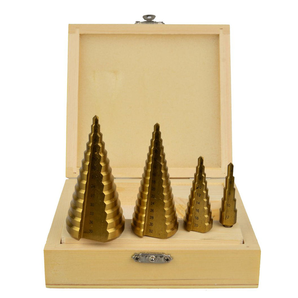 Burghiul de 4-12 mm include treptele de 4, 6, 8, 10 si 12 mm, burghiul de 4-20 mm include treptele de 4, 6, 8, 10, 12, 14, 16, 18 si 20 mm, burghiul de 4-32 mm include treptele de 4, 6, 8, 10, 12, 14, 16, 18, 20, 22, 24, 26, 28, 30 si 32 mm, iar burghiul de 4-39 mm include treptele de 4, 6, 9, 12, 15, 18, 21, 24, 27, 30, 33, 36 si 39 mm. Toate burghiele au maner cilindric si gradatii marcate la fiecare 2 sau 3 mm. Setul este livrat intr-o cutie din lemn.