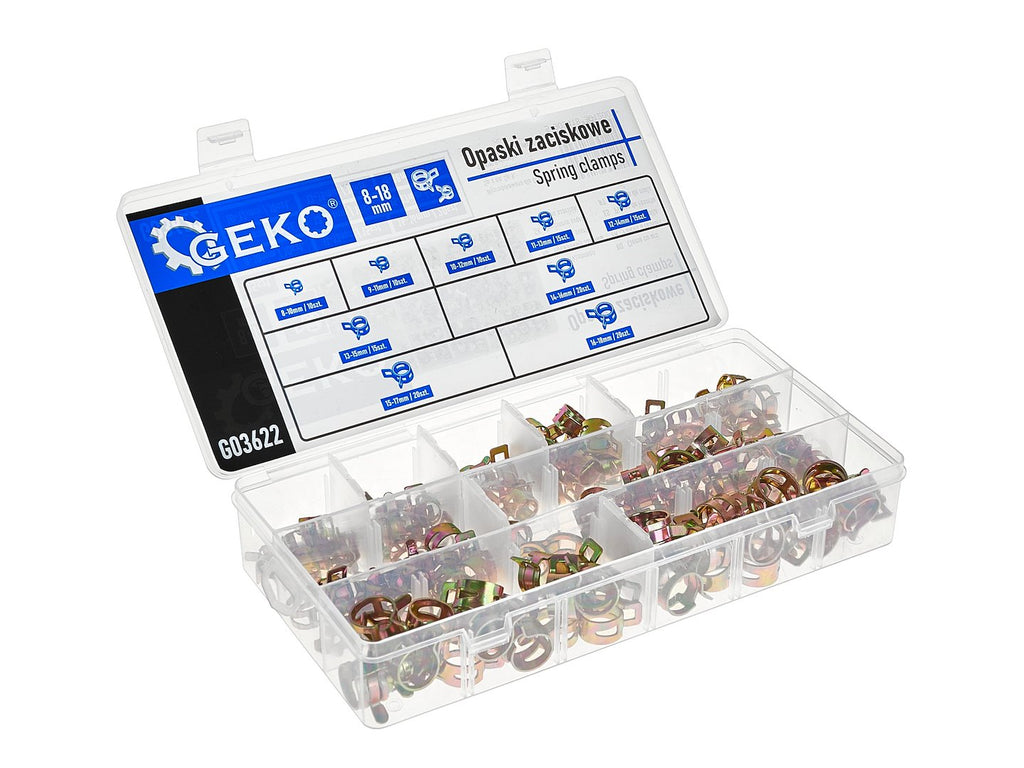 Acest SET COLIERE PENTRU FURTUNE 135 PIESE GEKO este destinat fixarii rapide si sigure a furtunelor, tevilor si cablurilor cu diametre cuprinse intre 8 si 18 mm. Colierele sunt de tip arc si sunt realizate din otel maleabil. Acest tip de constructie permite compensarea dilatarii materialului, fara slabirea prinderii in timpul functionarii. Colierele sunt adecvate pentru utilizare in instalatii auto, motociclete, utilaje agricole, echipamente industriale si aplicatii de atelier. Suprafata colierelor este tratata pentru protectie impotriva coroziunii.