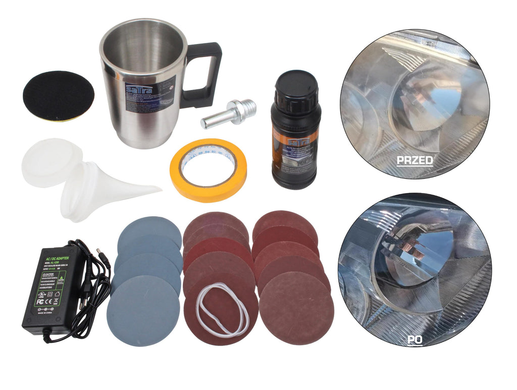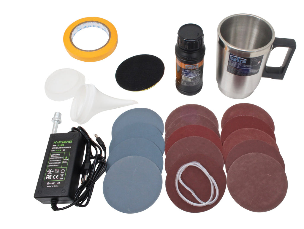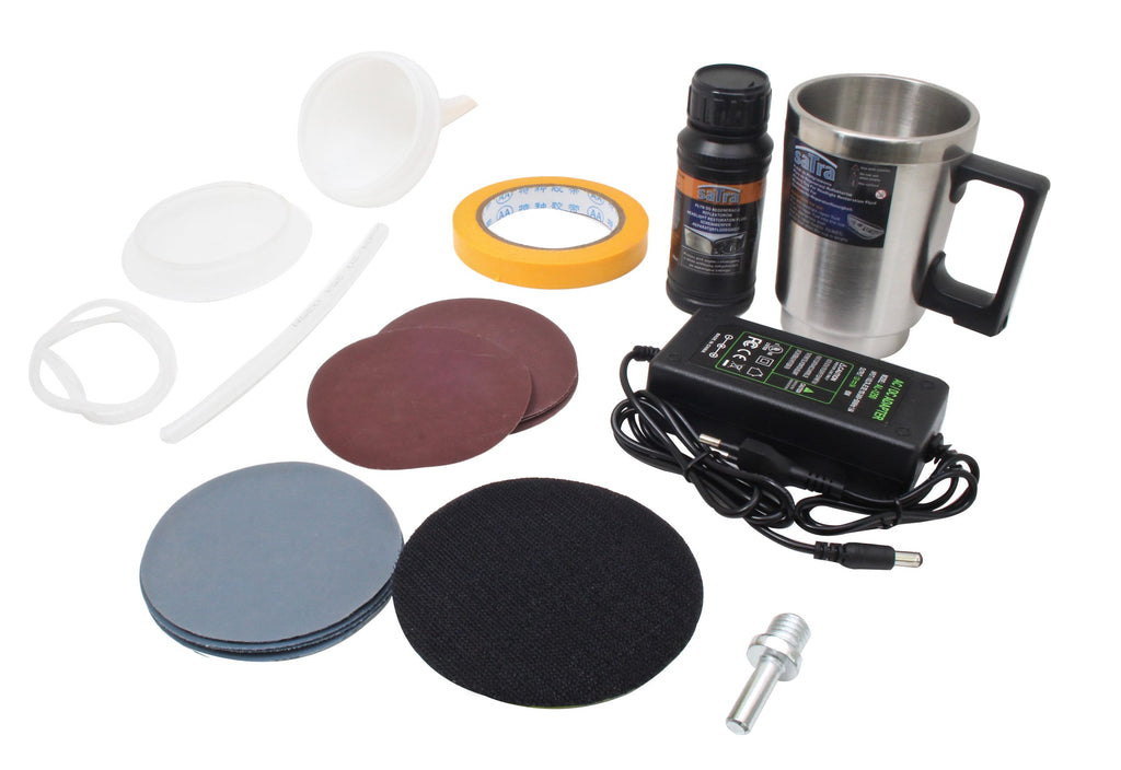 Setul contine discuri abrazive P800, P1000, P1200, P1500, P2000, P2500 si P3000, cate doua din fiecare tip, un flacon de 100 ml cu lichid de restaurare, o cupa pentru aplicarea lichidului, capac din plastic pentru cupa, doua garnituri pentru cupa, o sursa de alimentare de 230 V, un burete de lustruit cu prindere velcro, un adaptor cu filet M10 si un capac pentru pahar cu furtun flexibil.