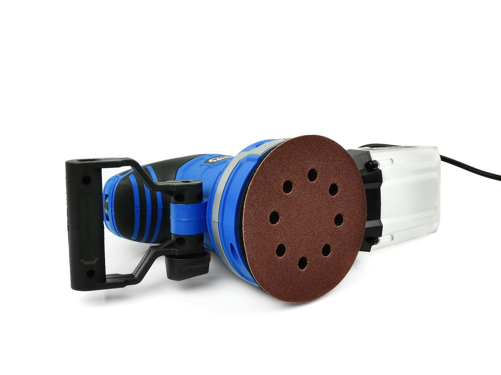 Discul de slefuire are diametrul de 125 mm si este realizat din spuma flexibila de inalta densitate, adaptandu-se la suprafata prelucrata. Slefuitorul este echipat cu sistem de aspirare a prafului pentru mentinerea curateniei la locul de munca. Manerul principal are insertii din cauciuc antiderapant pentru prindere sigura, iar manerul auxiliar este reglabil. Clasa de protectie este II.