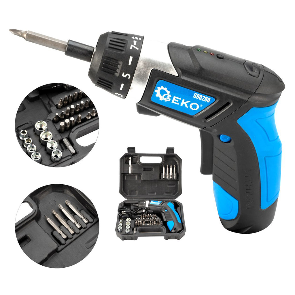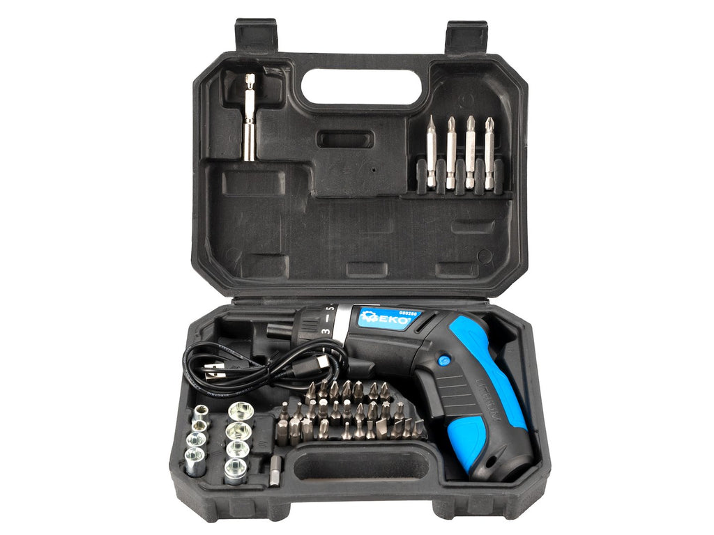 Aceasta SURUBELNITA ELECTRICA REINCARCABILA 3.6 V 1300 mAh GEKO este destinata operatiilor de insurubare si desurubare in aplicatii de atelier, mentenanta sau uz general. Dispozitivul este alimentat de un acumulator Li-Ion de 3,6 V cu capacitatea de 1300 mAh, functioneaza cu o singura treapta de viteza si este prevazut cu functie de rotatie inainte si inapoi. Timpul de incarcare completa este de pana la 5 ore. Surubelnita este echipata cu iluminare LED pentru lucrul in zone slab luminate si cu indicator luminos al nivelului de incarcare a bateriei. Alimentarea se face exclusiv din acumulator, fara a fi necesare baterii externe, iar incarcatorul este inclus.