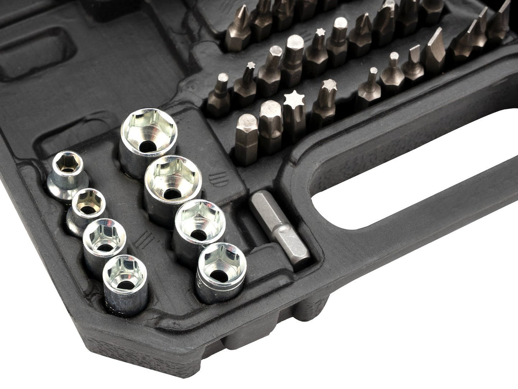 Pentru lucrari de precizie sunt incluse biti de 25 mm, respectiv biti plati de 3 mm, 4 mm, 5 mm, 6 mm si 7 mm, biti Pozidriv PZ0, PZ1, PZ2 si PZ3, biti Philips PH0, PH1, PH2 si PH3, biti Torx T10, T15, T20, T25, T27, T30, T40 si T45, precum si biti hexagonali H2, H2.5, H3, H3.5, H4, H5 si H6. Toate accesoriile sunt concepute pentru compatibilitate directa cu surubelnita si permit utilizarea intr-o gama larga de aplicatii.
