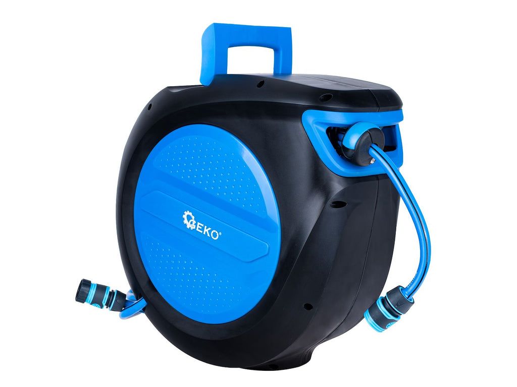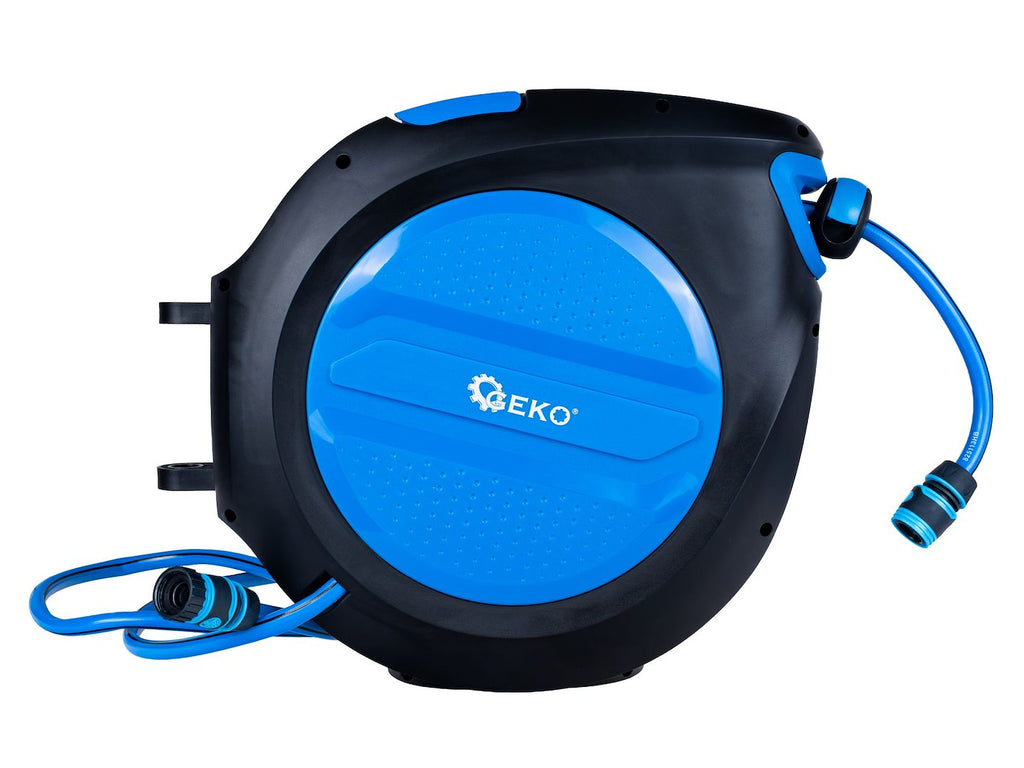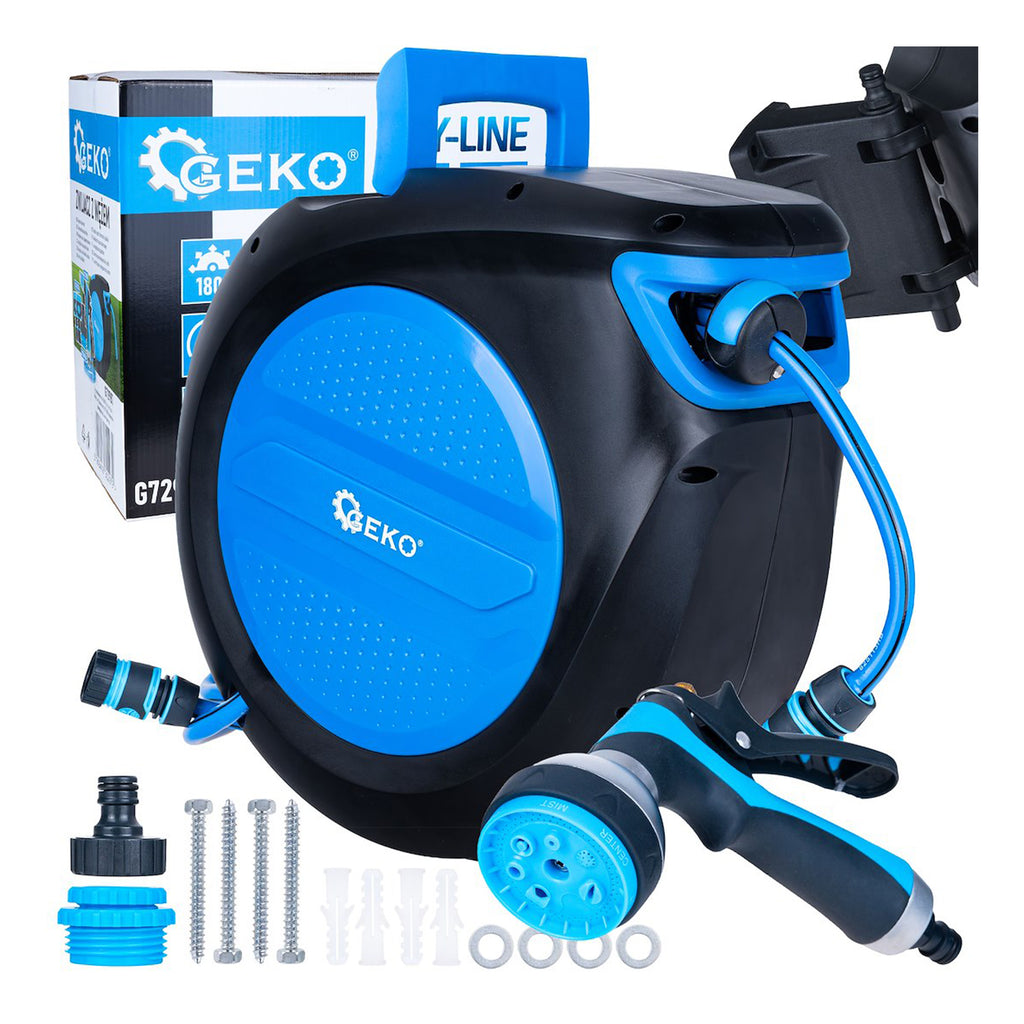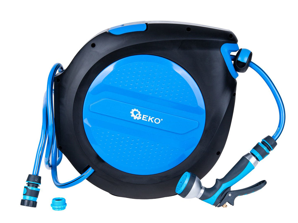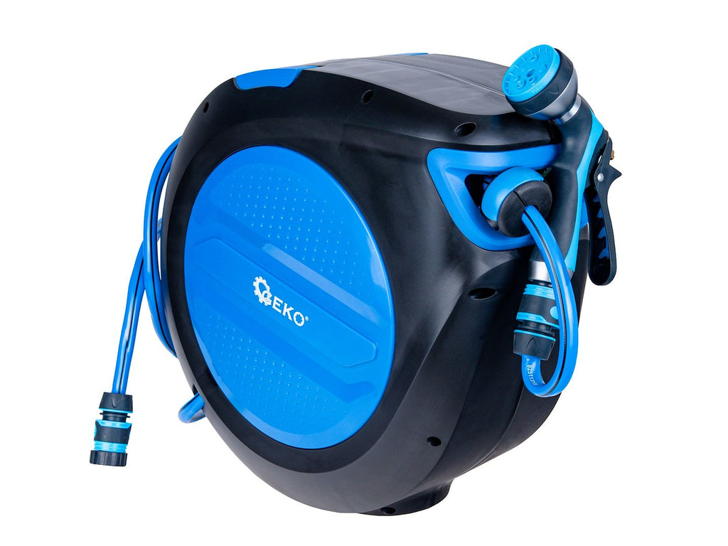 TAMBURUL AUTOMAT SKY-LINE CU FURTUN DE GRADINA 30M 1/2", PERETE, CU PISTOL 7 FUNCTII - GEKO este destinat udarii gradinii si lucrarilor exterioare, fiind prevazut cu sistem automat de retractare si suport pentru montare pe perete. Furtunul are lungimea de 30 m si diametrul de 1/2", iar furtunul de conectare are lungimea de 1,9 m.