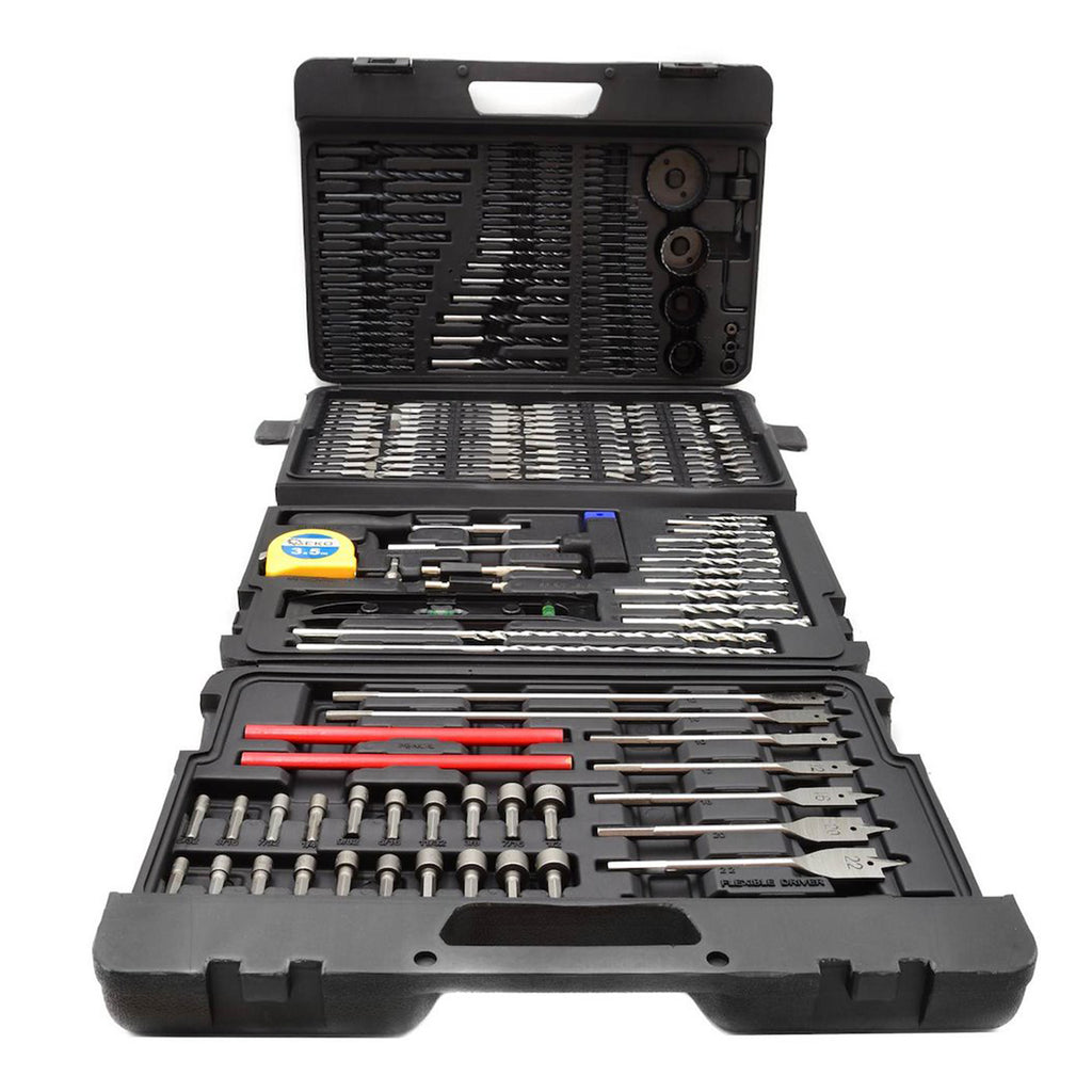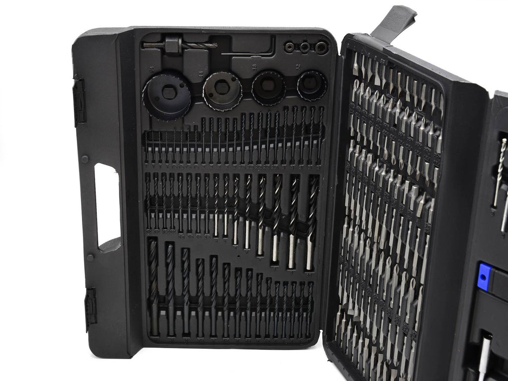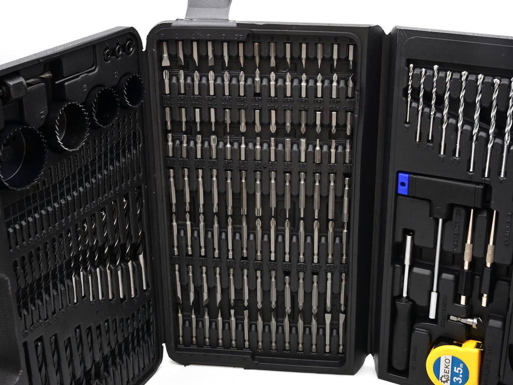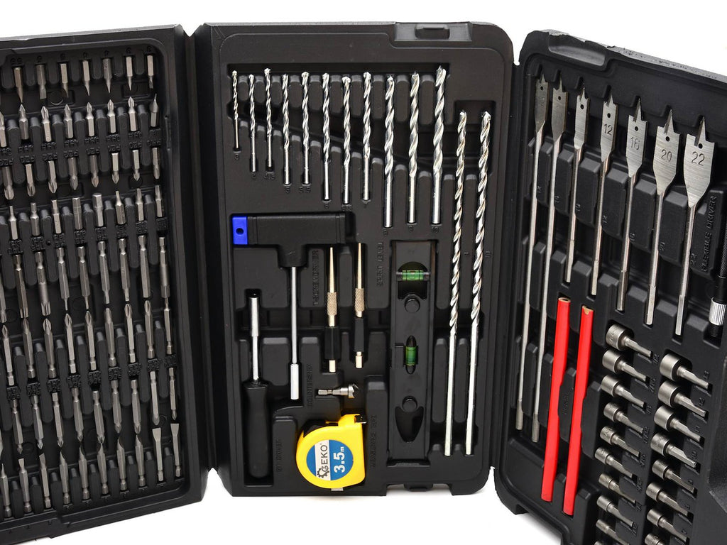 Setul include tubulare 1/4" metrice in dimensiunile 5, 5.5, 6, 7, 8, 9, 10, 11, 12 si 13 mm, precum si tubulare 1/4" in inch: 5/32", 3/16", 7/32", 1/4", 9/32", 5/16", 11/32", 3/8", 7/16", 1/2". Burghiele pentru metal HSS sunt in dimensiunile 1 mm (4 buc.), 1.5 mm (4 buc.), 2 mm (5 buc.), 2.5 mm (5 buc.), 3 mm (5 buc.), 3.2 mm (4 buc.), 3.5 mm (4 buc.), 4 mm (5 buc.), 4.5 mm (1 buc.), 5 mm (1 buc.), 5.5 mm (1 buc.), 6 mm (1 buc.), 6.5 mm (1 buc.), 7 mm (1 buc.), 7.5 mm (1 buc.), 8 mm (1 buc.), 9 mm (1 buc.), 10 mm (1 buc.).