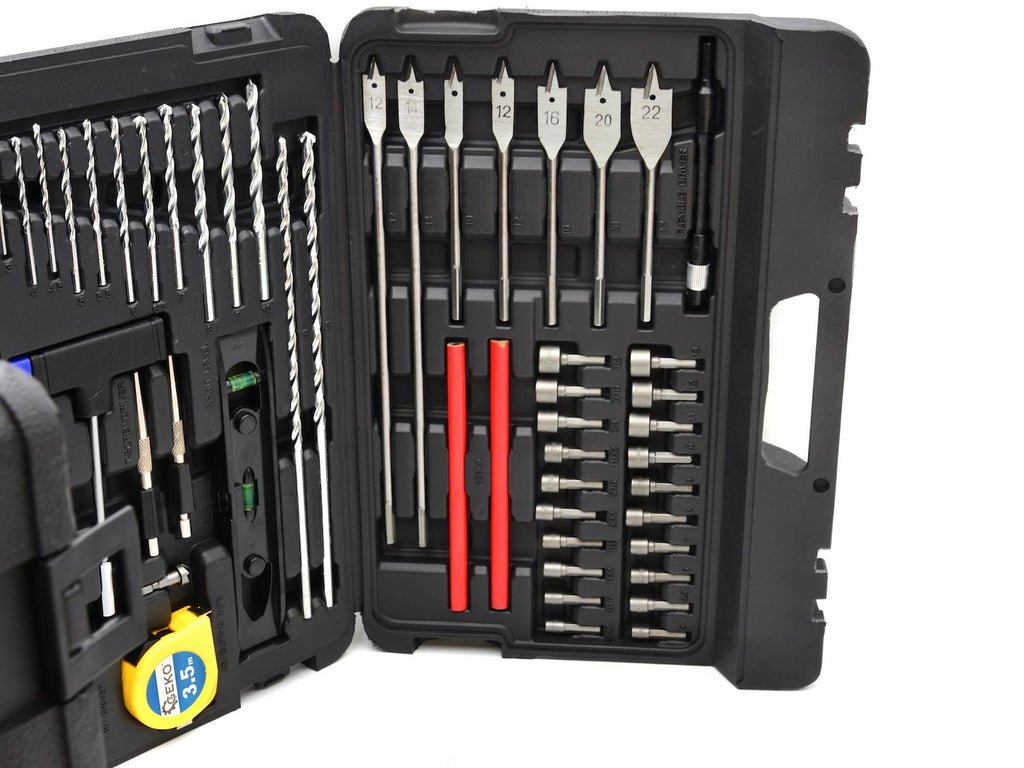 Sunt incluse burghie plate pentru lemn de 10, 12, 16, 20 si 22 mm (150 mm lungime), precum si 12 si 14 mm (300 mm lungime). Trusa mai contine adaptor pentru carote, suport biti 1/4", prelungitor flexibil 1/4", surubelnita tip T cu varf magnetic, alezor/countersink, 3 limitatoare de adancime (3, 5, 6 mm), nivela de 200 mm, ruleta de 3,5 m, doua dornuri 1.5 si 2.5 mm, doua creioane de tamplarie si cheie imbus 2.5 mm.