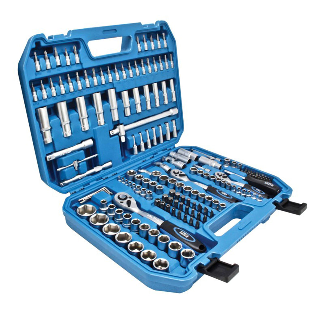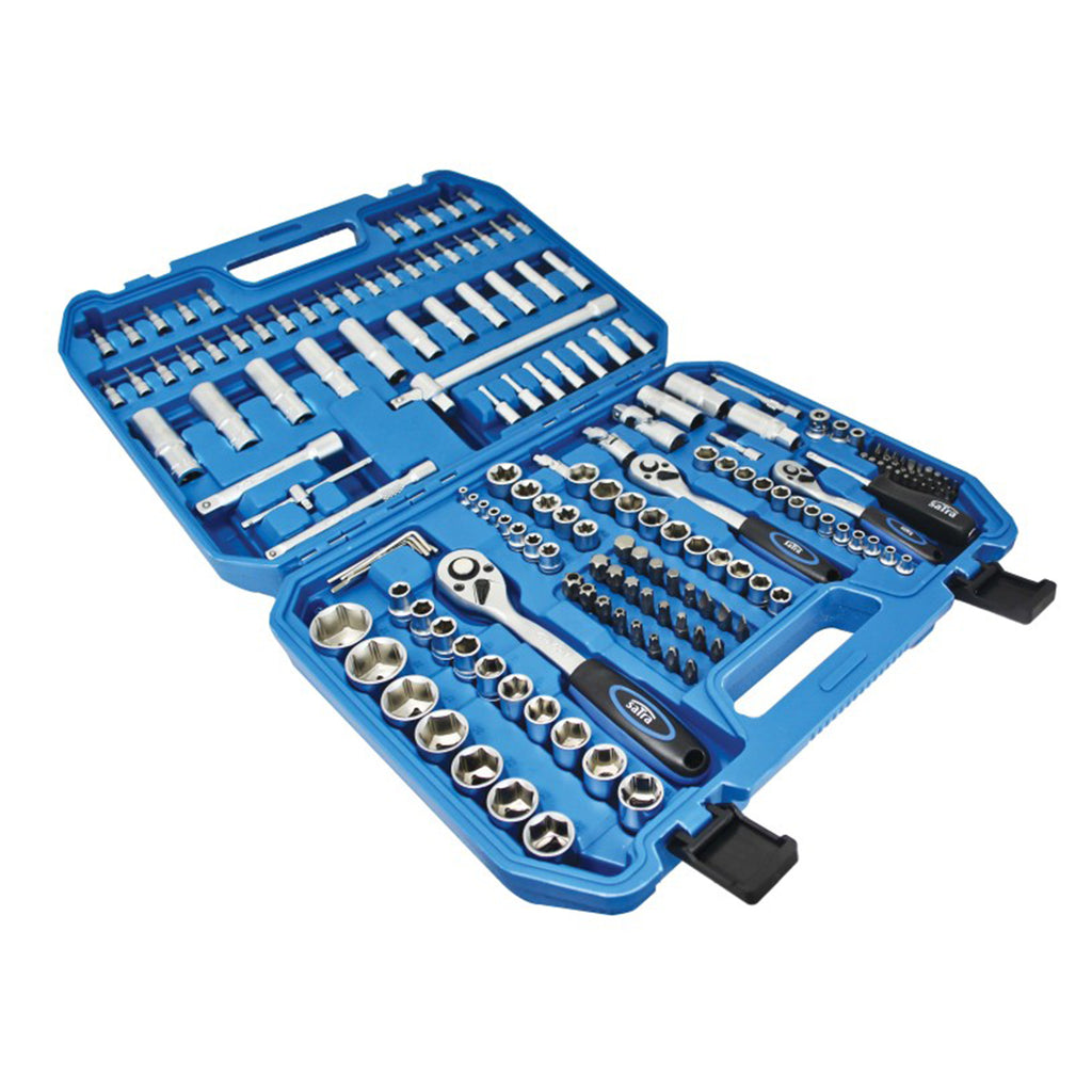 TRUSA DE SCULE CU CHEI TUBULARE, BITI SI CLICHETI 1/4 3/8 1/2 179 PIESE SATRA contine elemente realizate din otel crom-vanadiu cromat si este echipata cu chei tubulare prevazute cu sistem Super Lock, care impiedica alunecarea de pe stift in timpul utilizarii.