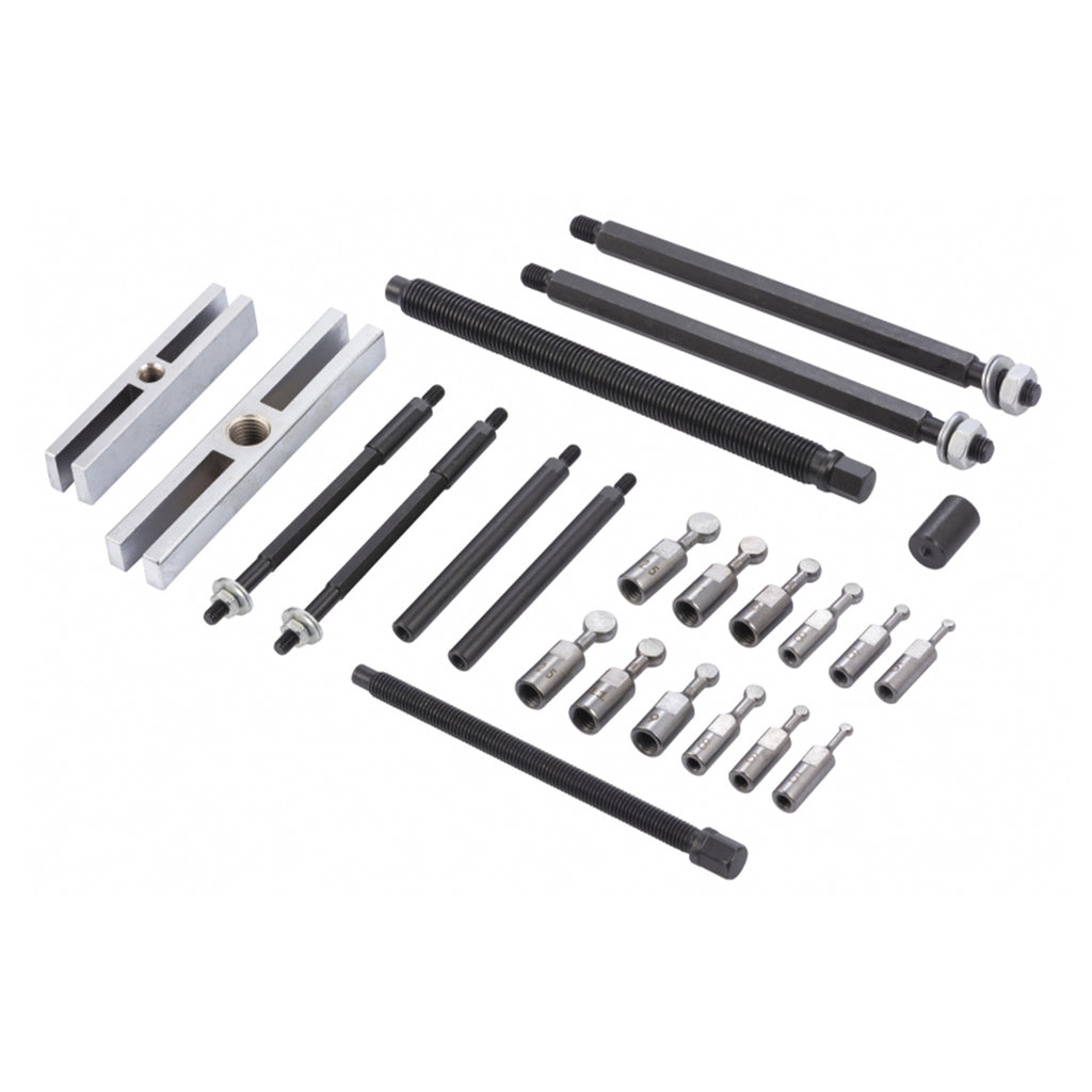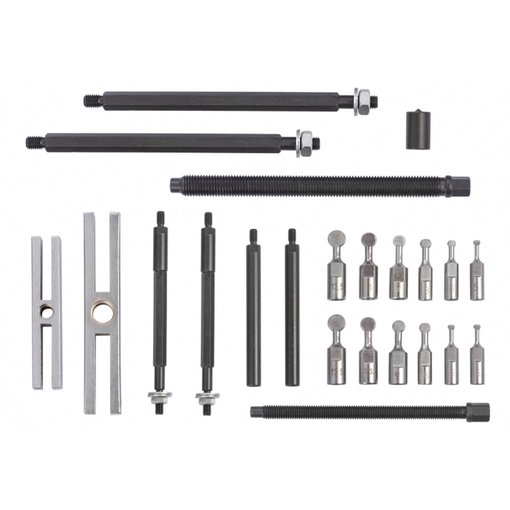 TRUSA EXTRACTOR RULMENTI 5-12.5MM 25 PIESE ste destinata indepartarii rulmentilor cu bile prin prinderea adaptoarelor cu capete sferice in inelul rulmentului. Dupa blocarea adaptoarelor, extractorul permite extragerea precisa si sigura.