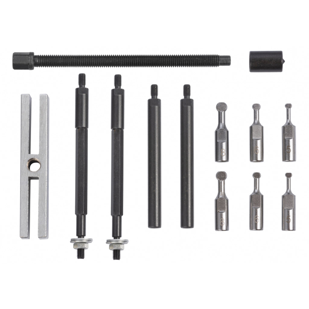 TRUSA EXTRACTOR RULMENTI 5.5-8MM 15 PIESE este destinata indepartarii rulmentilor cu bile din inelele interioare. Adaptoarele cu capete sferice inlocuibile, de 5.5 mm, 6 mm si 8 mm, se monteaza in inelul rulmentului si, prin blocare, permit extragerea sigura si precisa.