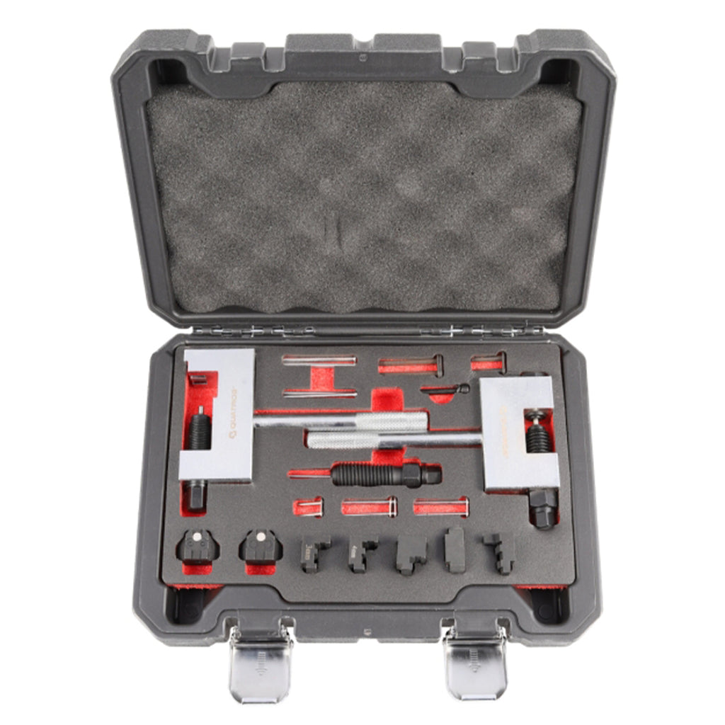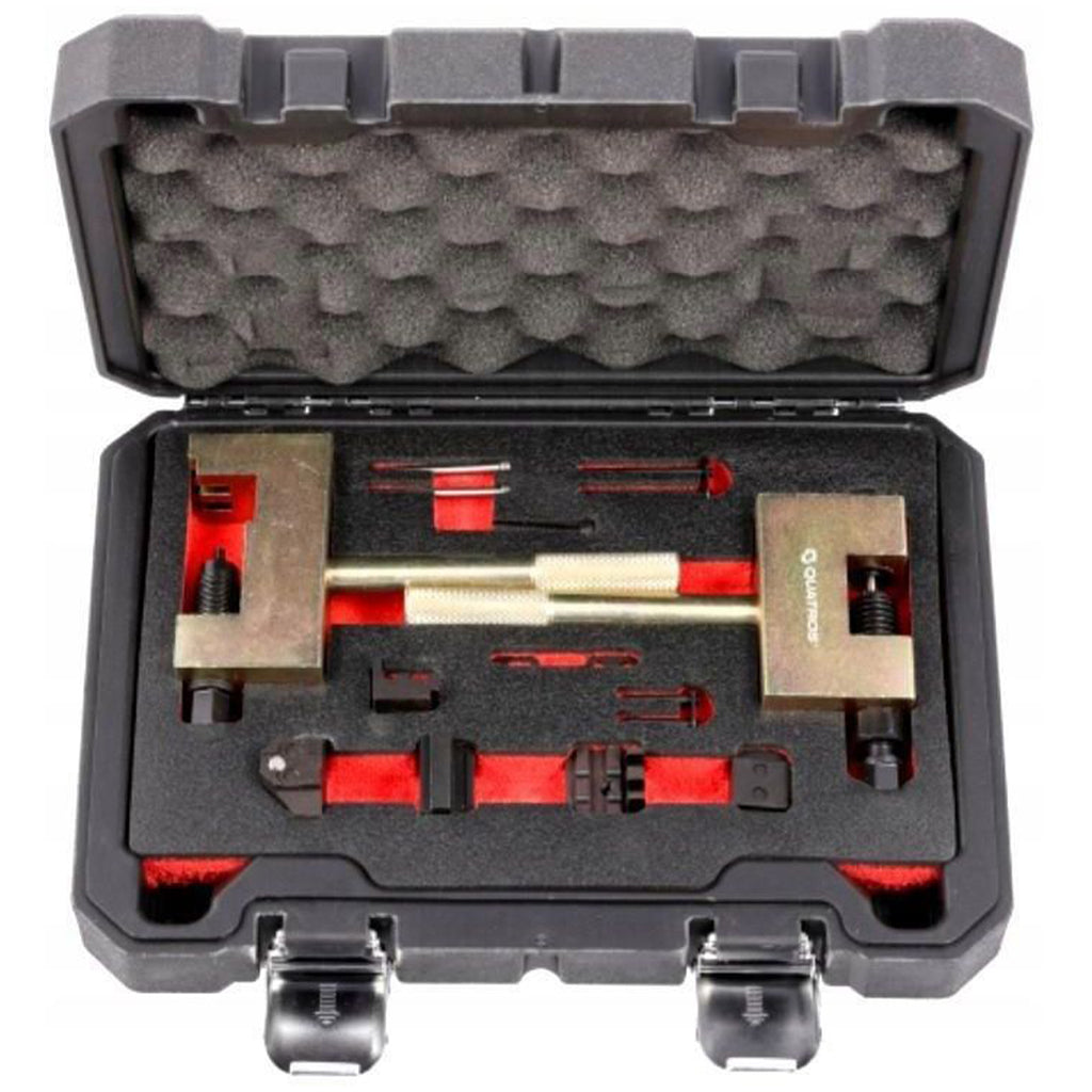 TRUSA NITUIT LANT DISTRIBUTIE MERCEDES BENZ este destinata sertizarii si desfaceri lanturilor de distributie simple (Simplex) si duble (Duplex) cu pini de 3 mm sau 4 mm. Setul include unelte dedicate pentru ruperea si sertizarea lantului, precum si accesorii pentru montaj temporar si ghidare. Este compatibila cu o gama larga de motoare Mercedes-Benz, Chrysler si Jeep, acoperind motoarele diesel CDI si CRD cu capacitati intre 1.7 si 4.0 litri. Trusa contine unelte de rupere si sertizare a lantului, suruburi si stifturi de ghidare, verigi de legatura temporare, elemente de presiune pentru asamblare si sertizare, sine de ghidare pentru legaturi simplex si duplex, falci de prindere, surub de blocare si cleme de fixare, toate realizate conform standardelor OEM Mercedes-Benz.