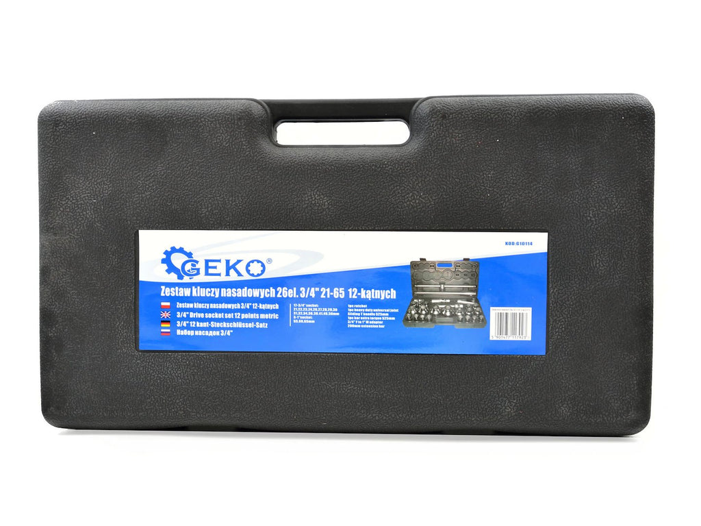 Aceasta TRUSA TUBULARE BIHEXAGONALE 3/4'' 1'' CU CLICHET 21-65mm 26 PIESE GEKO este destinata lucrarilor de montaj si demontaj in aplicatii auto, industriale si de service greu, unde sunt necesare dimensiuni mari si cupluri ridicate. Trusa este echipata cu tubulare bihexagonale (12 muchii) cu prindere de 3/4" si 1", realizate din otel crom-vanadiu aliat, forjat pentru rezistenta si durabilitate in conditii solicitante.